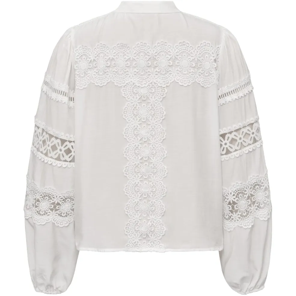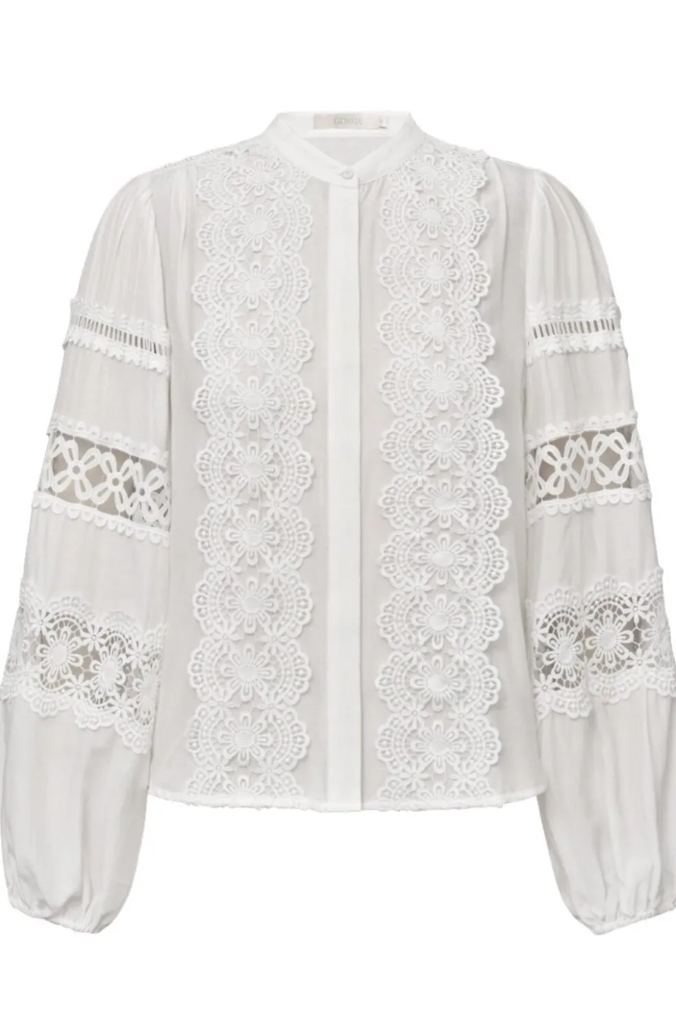Off-white skjorte fra Gossia med symmetrisk blondedesign. Skjorten har lange pufærmer og en klassisk skjortekrave, der gør den velegnet til både formelle og festlige anledninger.