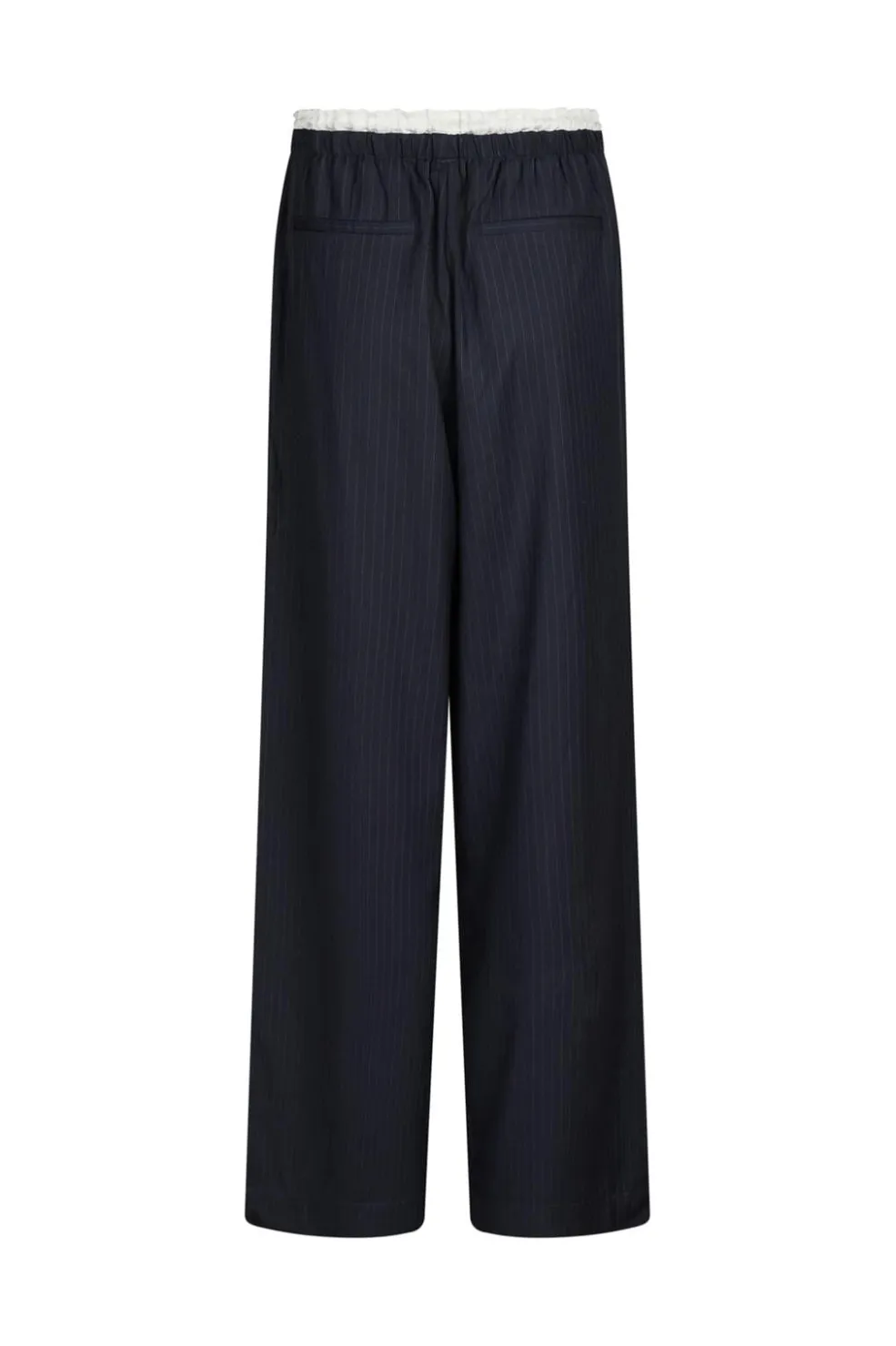 Mørkeblå bukser fra Neo Noir med pinstriber. De højtaljede bukser har en løs pasform og går helt ned til gulvet. Snøren i taljen kan justeres efter behov.