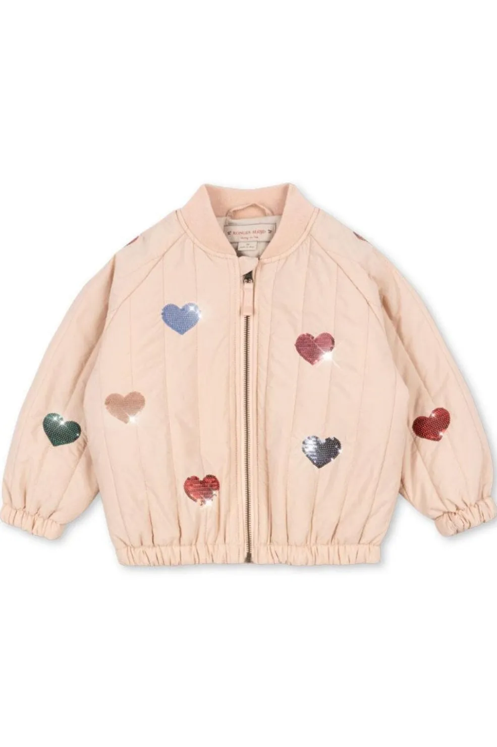 Bomberjakke fra Konges Sløjd i lyserød og beige nuance med hjerteformede pailletter i forskellige farver på forsiden.