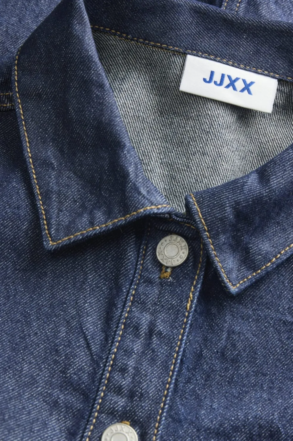 Mørkeblå denimkjole fra Jjxx med skjortekrave og brystlomme. Den har knapper hele vejen ned og korte ærmer.