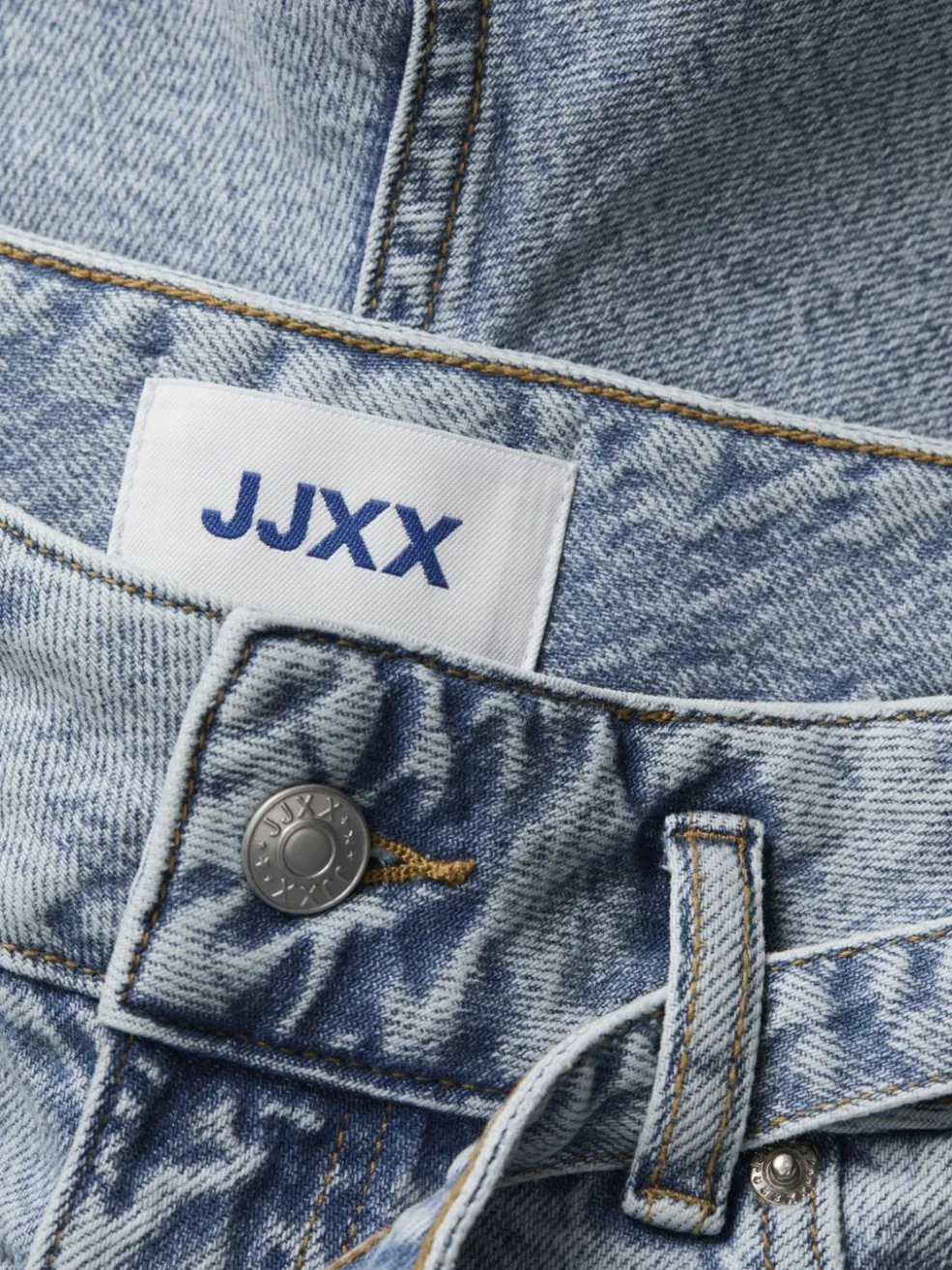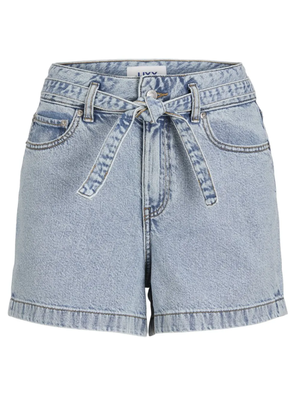 Lyseblå denimshorts fra Jjxx med høj paperbag-talje og bælte. Shortsene har stonewash-behandling og en loose fit-pasform med praktiske lommer både foran og bagpå.