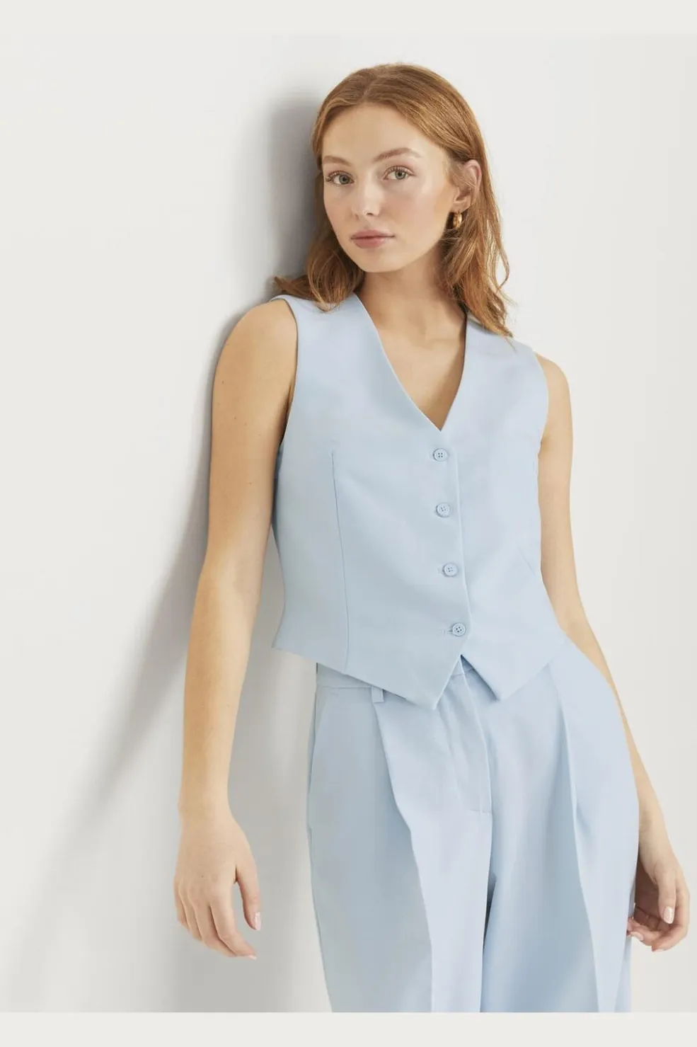 Lyseblå vest fra Jjxx med fiskebensmønster. Den har V-hals, knaplukning foran og er fuldt foret. Vesten er fremstillet i twill med et karakteristisk V-mønster.