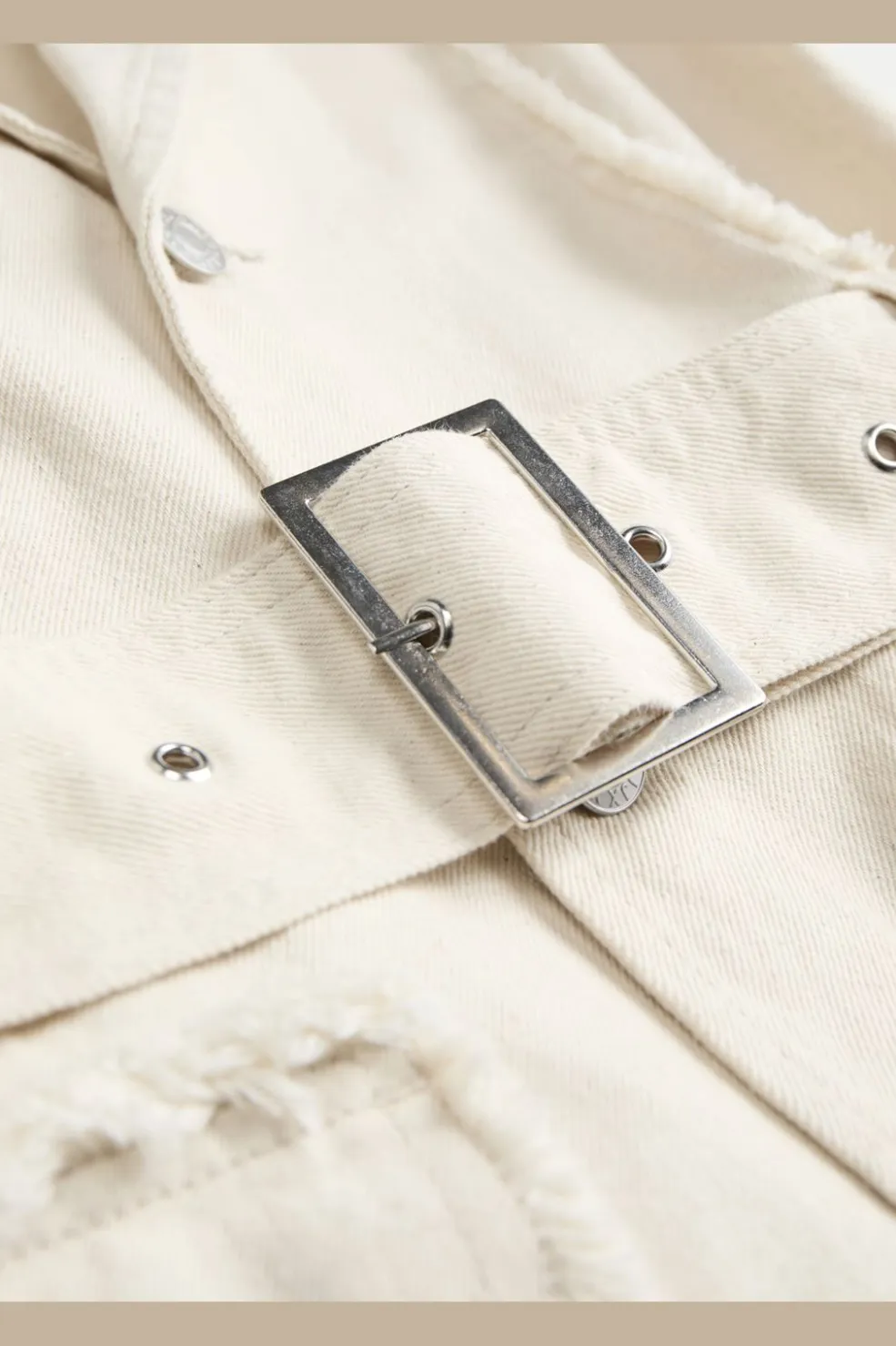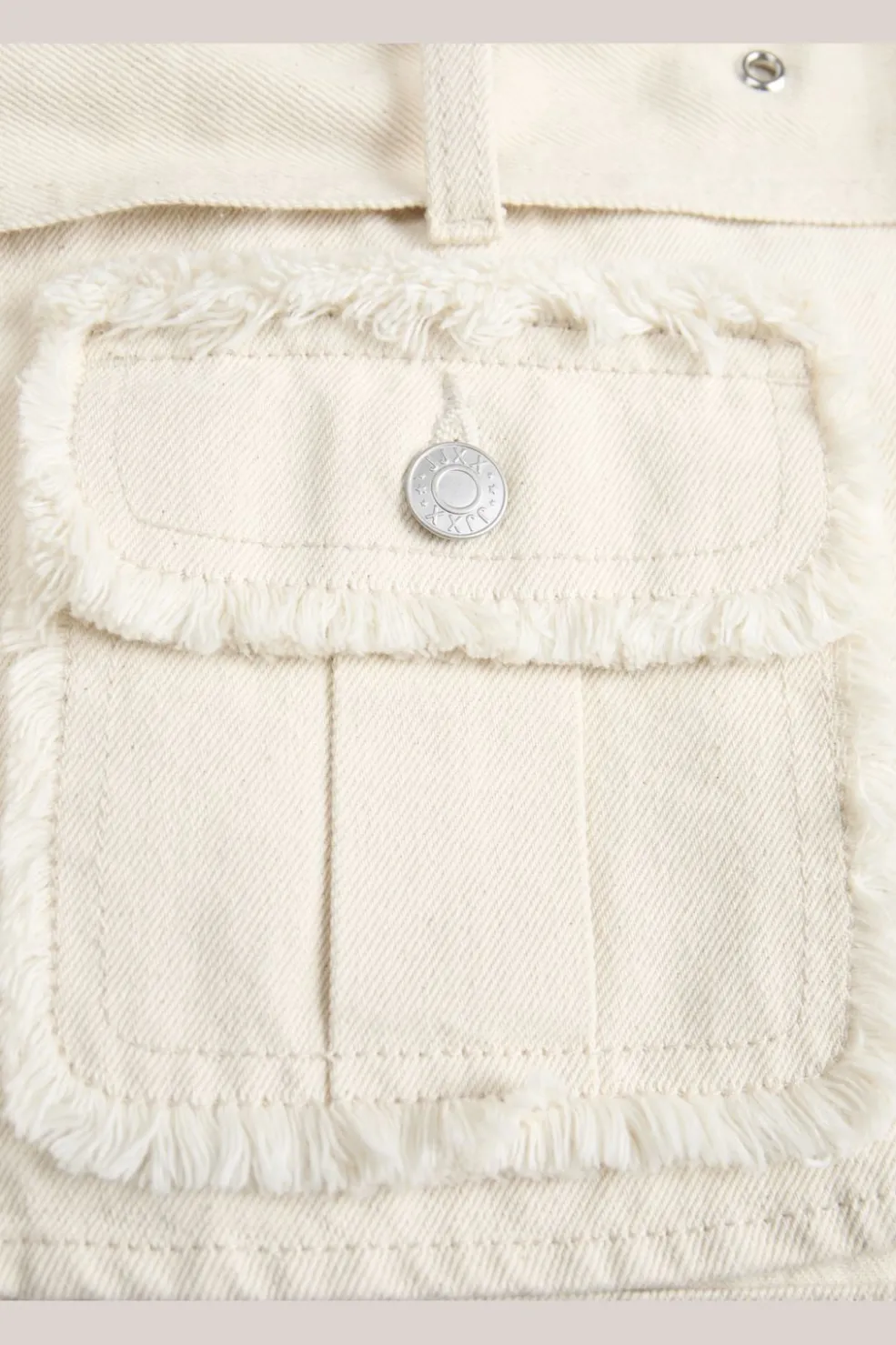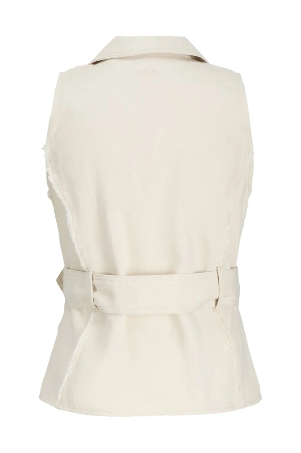 Ærmeløs vest fra Jjxx i raw ecru. Den har skjortekrave, knapper foran og frynsedetaljer ved lommerne. Et bælte i taljen giver mulighed for at tilpasse pasformen.