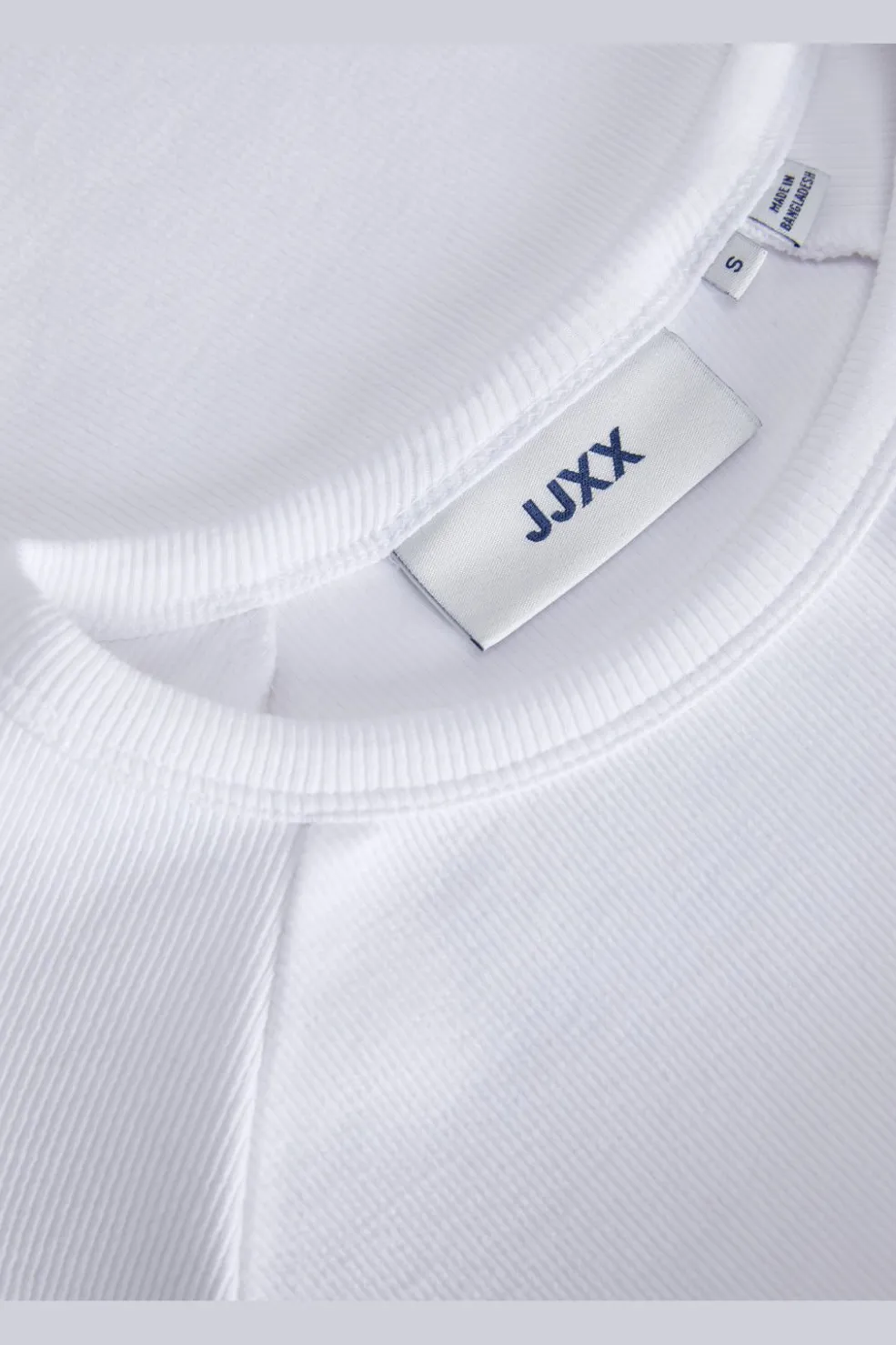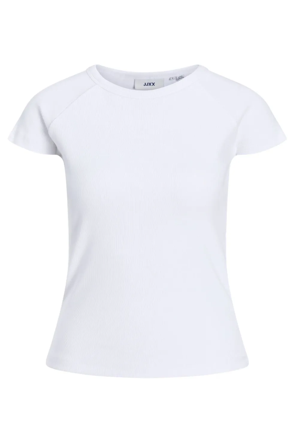 Hvid ribstrikket t-shirt fra Jjxx med tætsiddende pasform. T-shirten har en ribbet struktur, rund halsudskæring og korte ærmer.