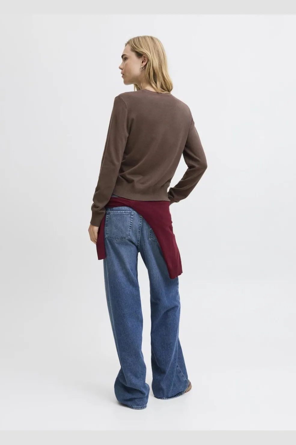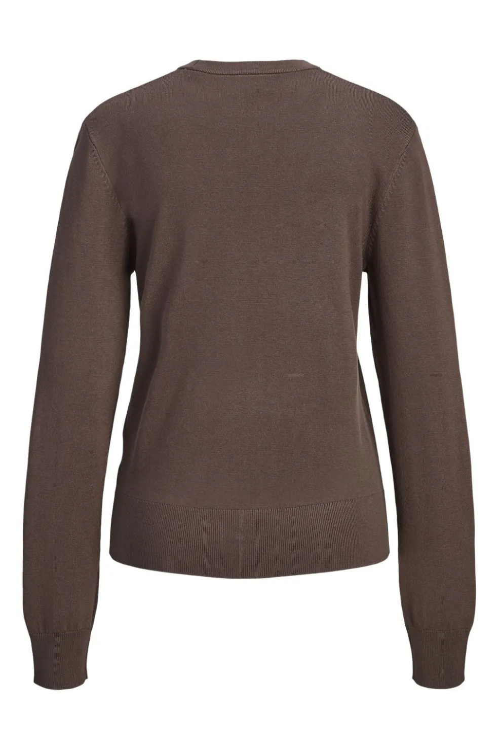 Brun striktrøje fra Jjxx i fladstrik. Trøjen har en rund halsudskæring og lange ærmer med ribkant ved håndleddene og nederste kant.