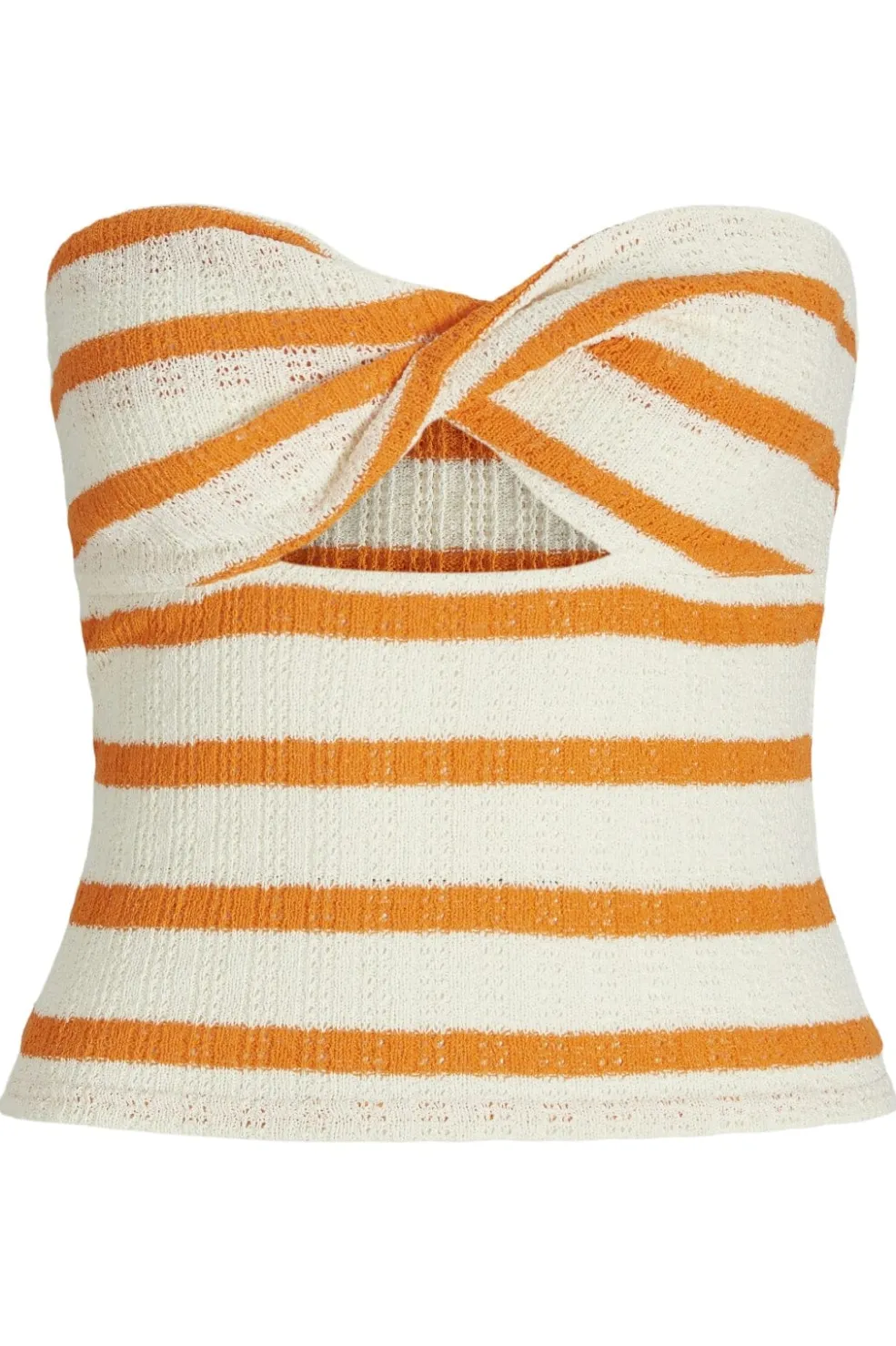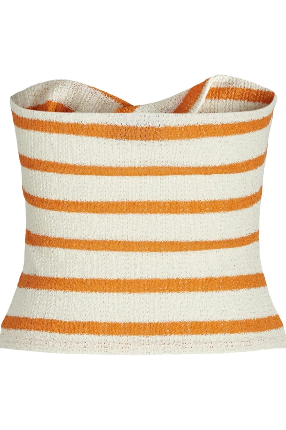 Bandeau-top fra Jjxx med striber i orange og vanilla ice. Toppen har et twist-design foran, der skaber et sommerligt udtryk. Den er lavet i en behagelig bomuldsblanding med stretch.