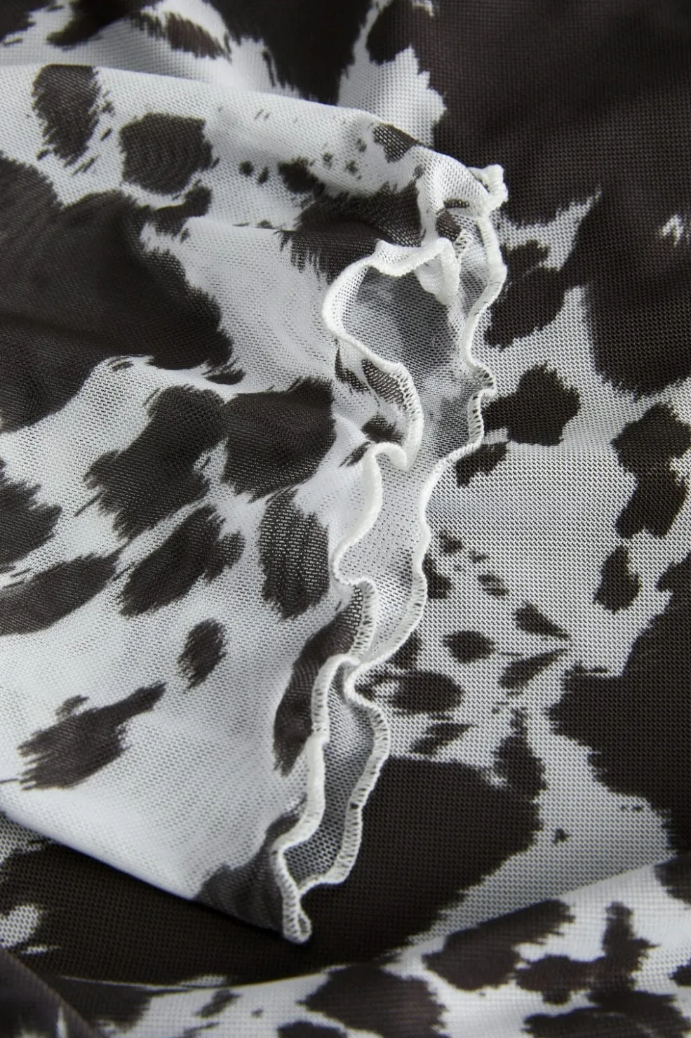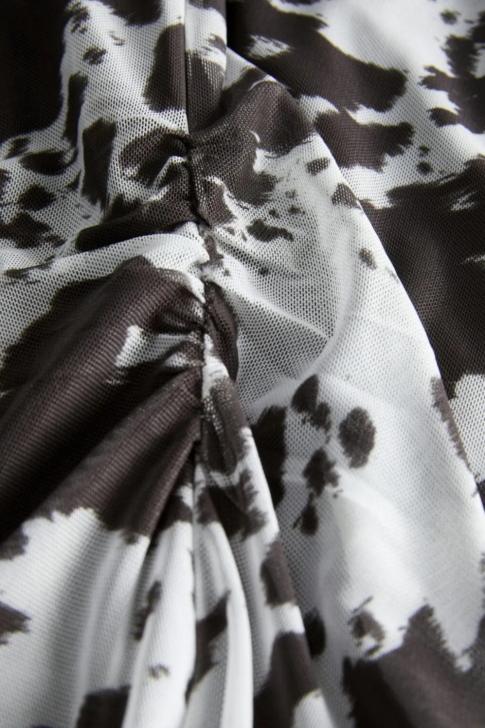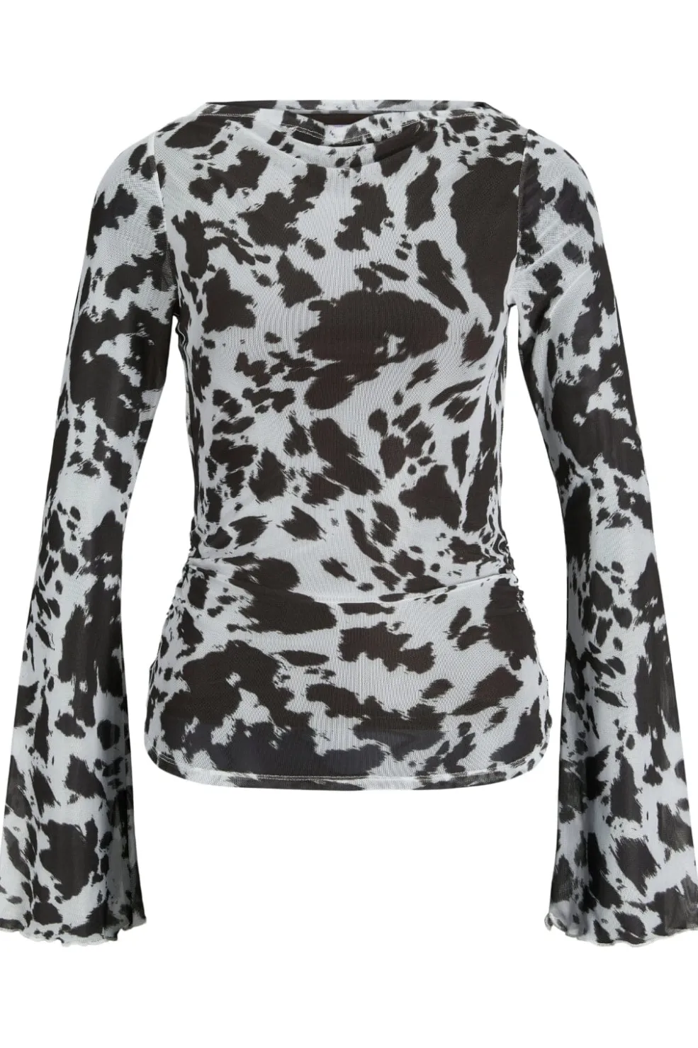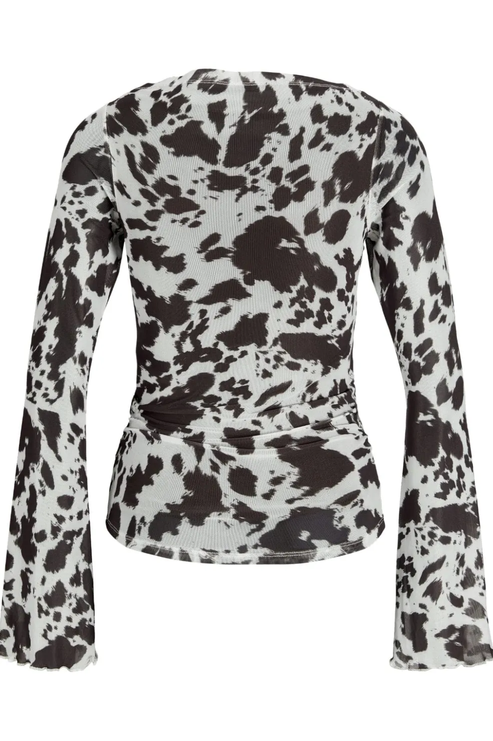Mesh-top fra Jjxx med sort og hvid cow print. Toppen har lange ærmer med flared manchetter og rynkede detaljer ved taljen. Den tætsiddende pasform fremhæver kroppens former.