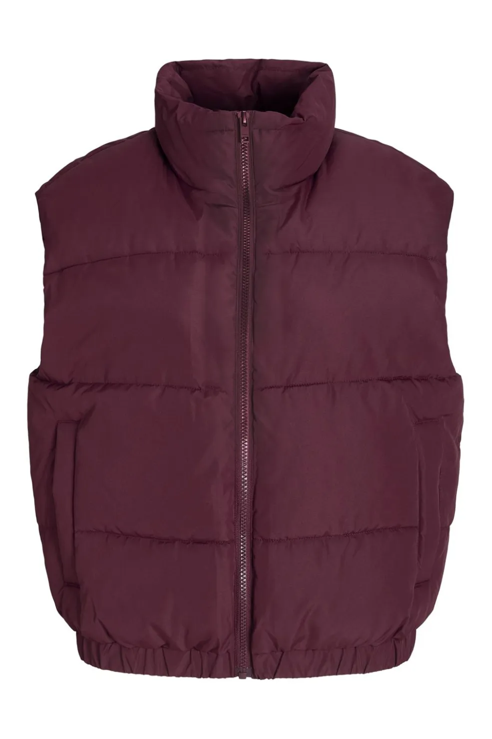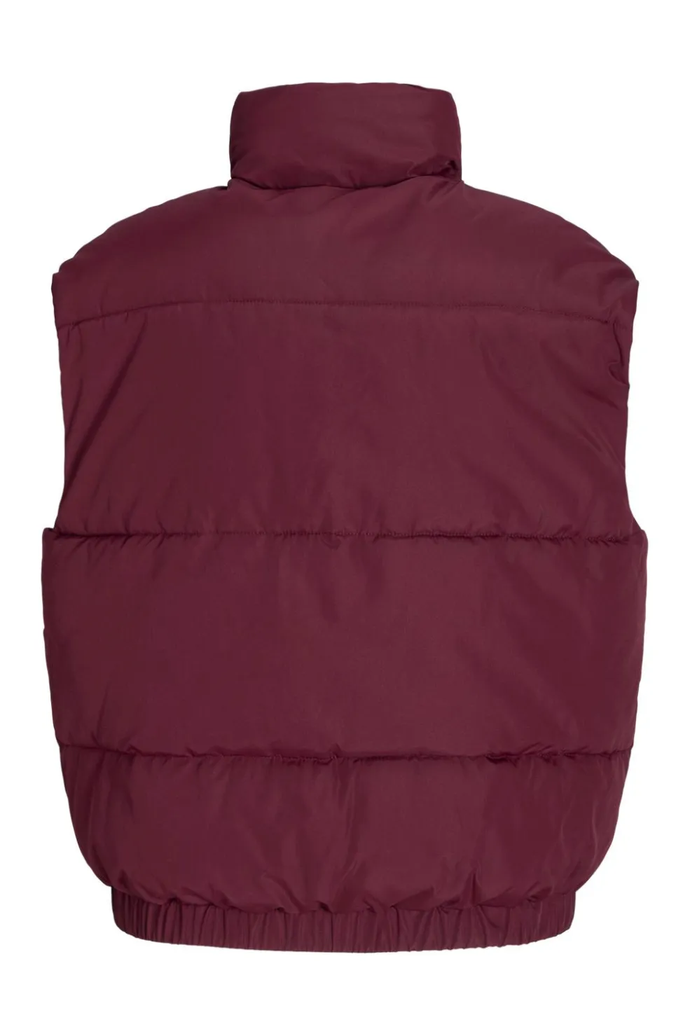 Puffer vest fra Jjxx i en dyb bordeauxrød farve. Vesten har en høj ståkrave og lynlåslukning foran. Det ærmeløse design gør den velegnet til lag-på-lag påklædning.