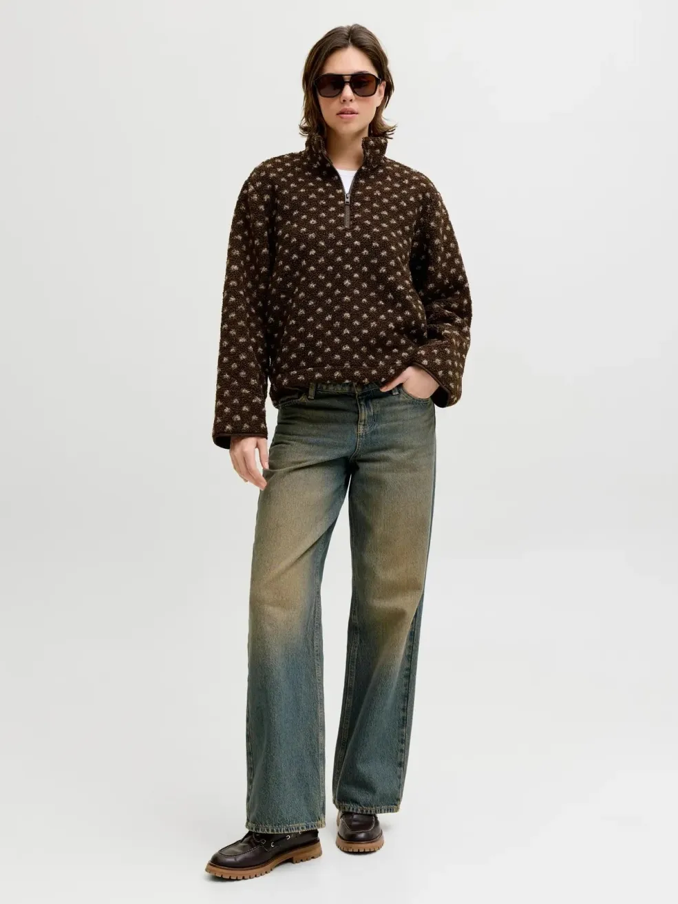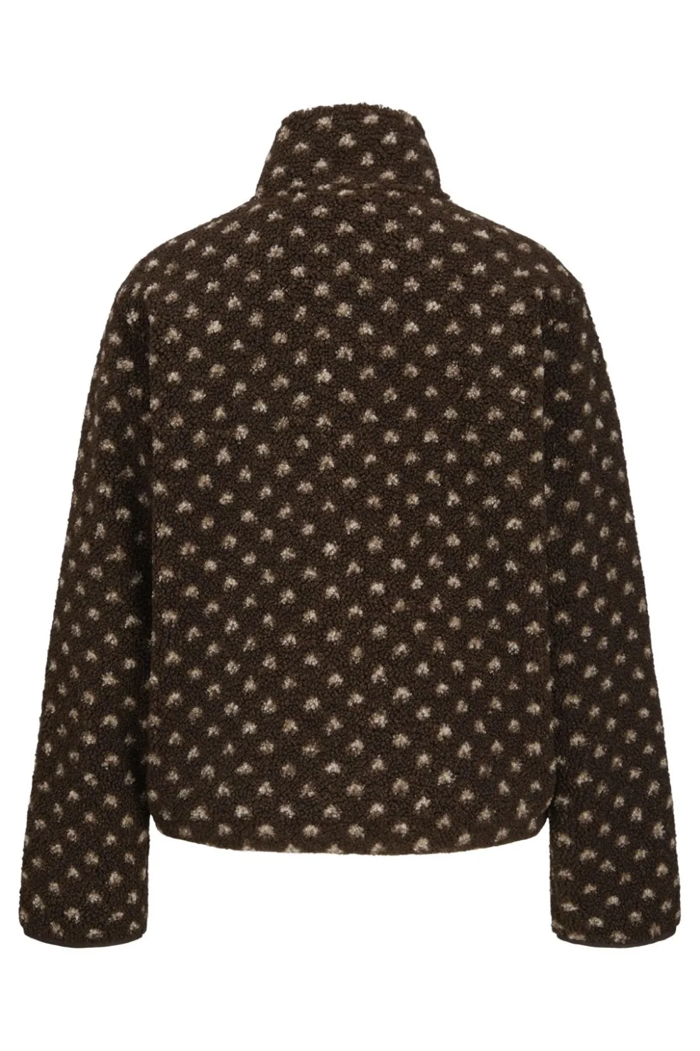 Brun teddyjakke fra Jjxx med polkaprikker i off-white. Jakken er lavet af blødt teddystof med høj krave og halvlang lynlås foran.