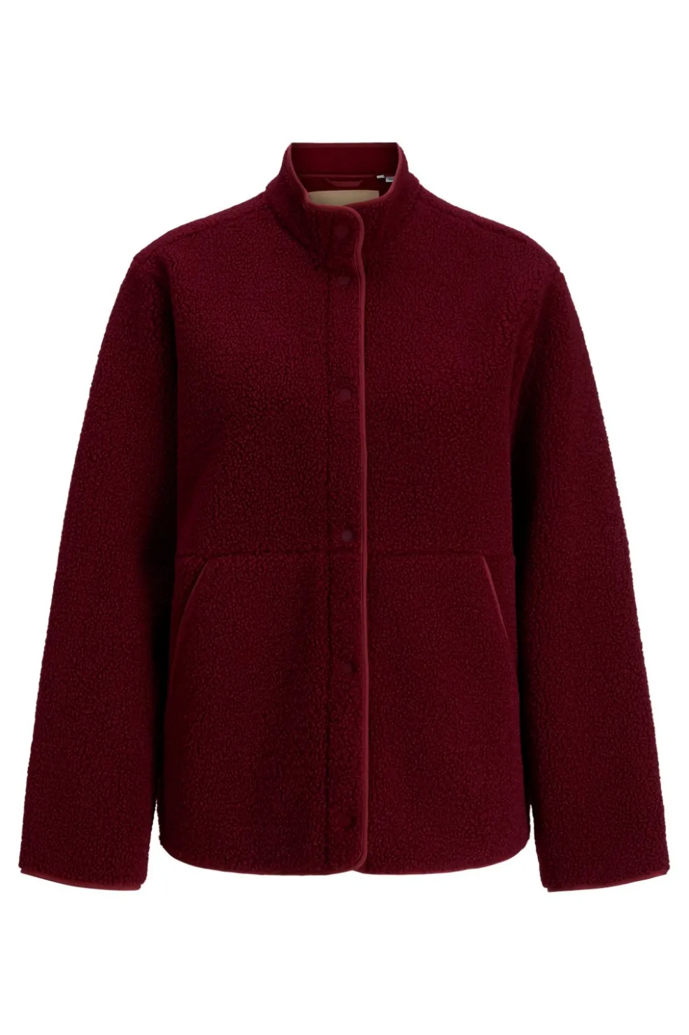 Teddyjakke fra Jjxx i bordeauxrød nuance. Den bløde jakke har en høj krave, lange ærmer og knaplukning foran. To praktiske forlommer giver plads til opbevaring.