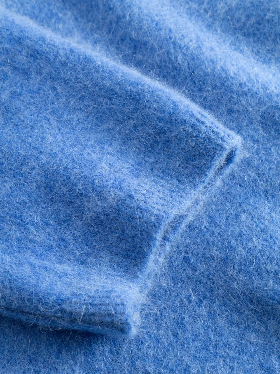 Strikket cardigan fra Noella i lyseblå. Den bløde mohairblanding giver en fluffy tekstur, og designet har rund hals med knaplukning foran.