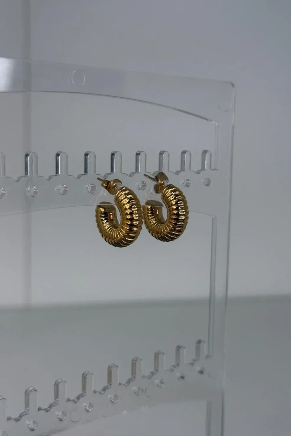 Gyldne øreringe fra Mellow Moon med buet form og rillede detaljer. Øreringene har en karakteristisk C-form med en struktureret overflade, der fanger lyset.