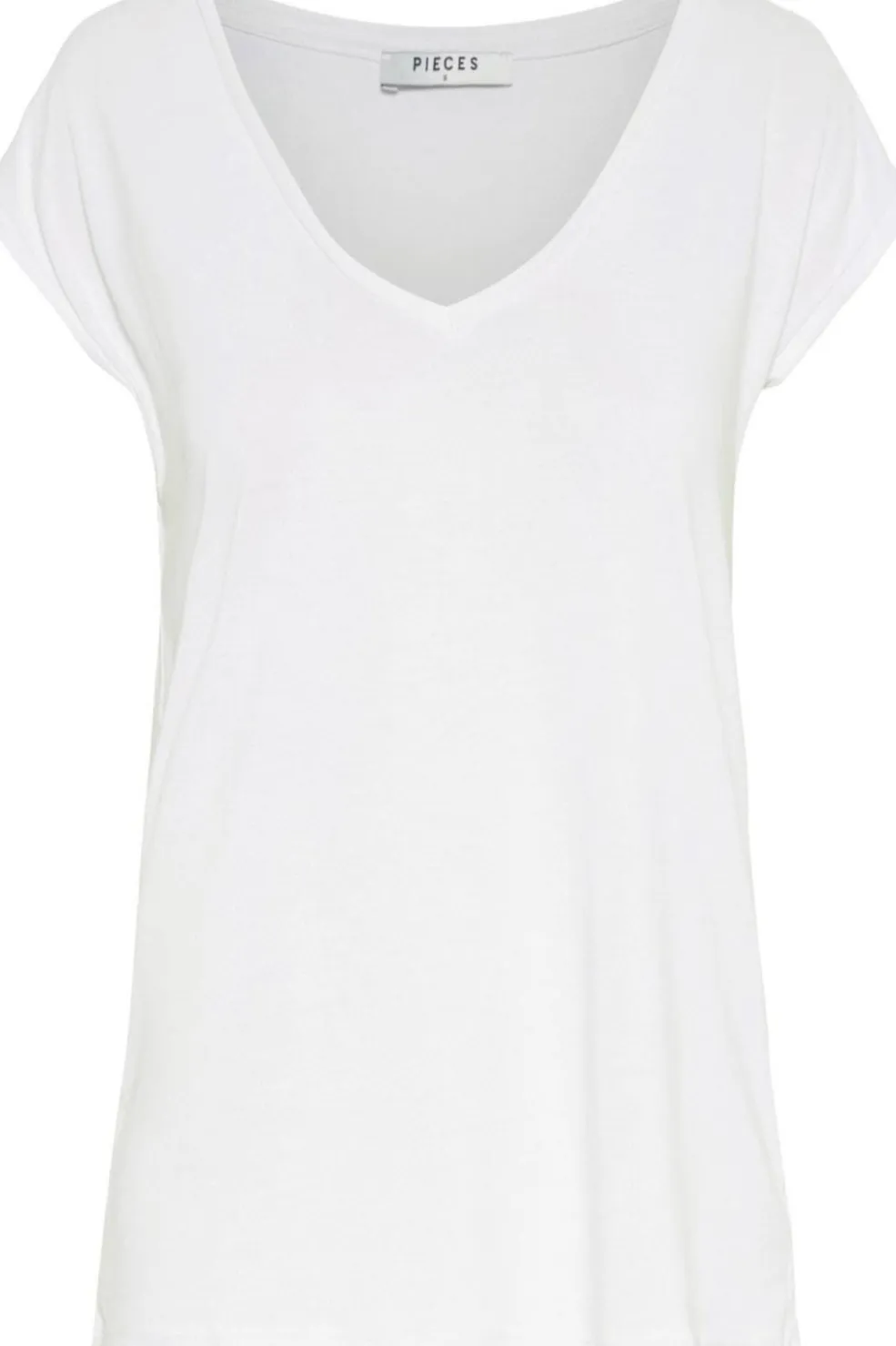 Hvid t-shirt fra Pieces med v-hals og rullede ærmer. Den løse pasform og det bløde materiale gør t-shirten nem at style til forskellige looks.