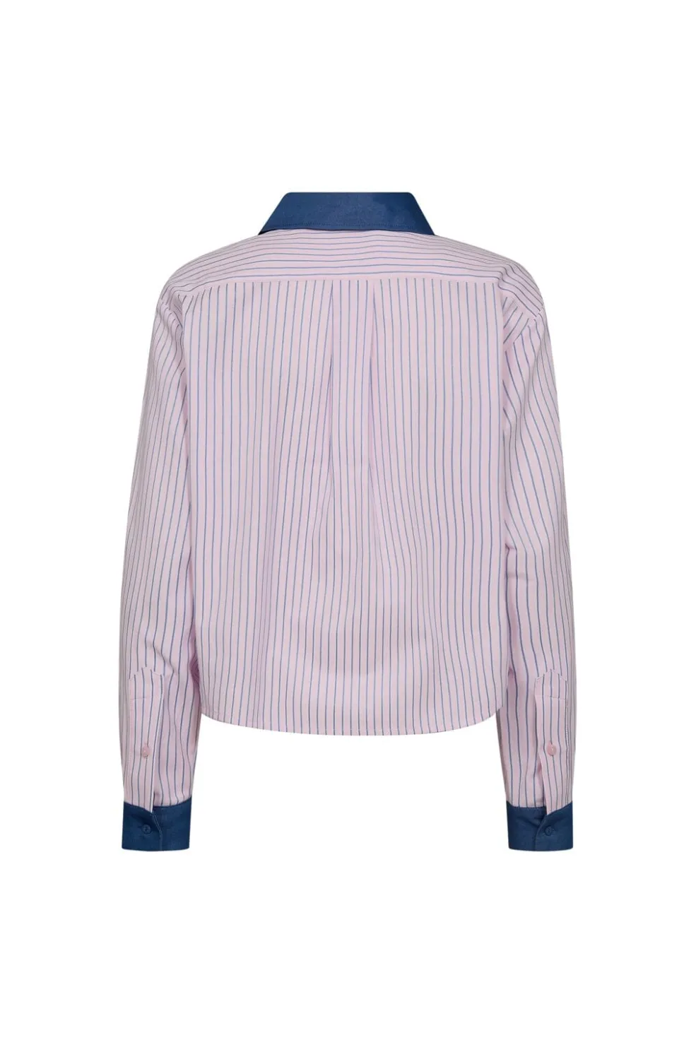 Stribet skjorte fra Co´Couture i lyserød med mørkeblå og blå lodrette striber. Skjorten har en kontrastfarvet blå krave og manchetter.