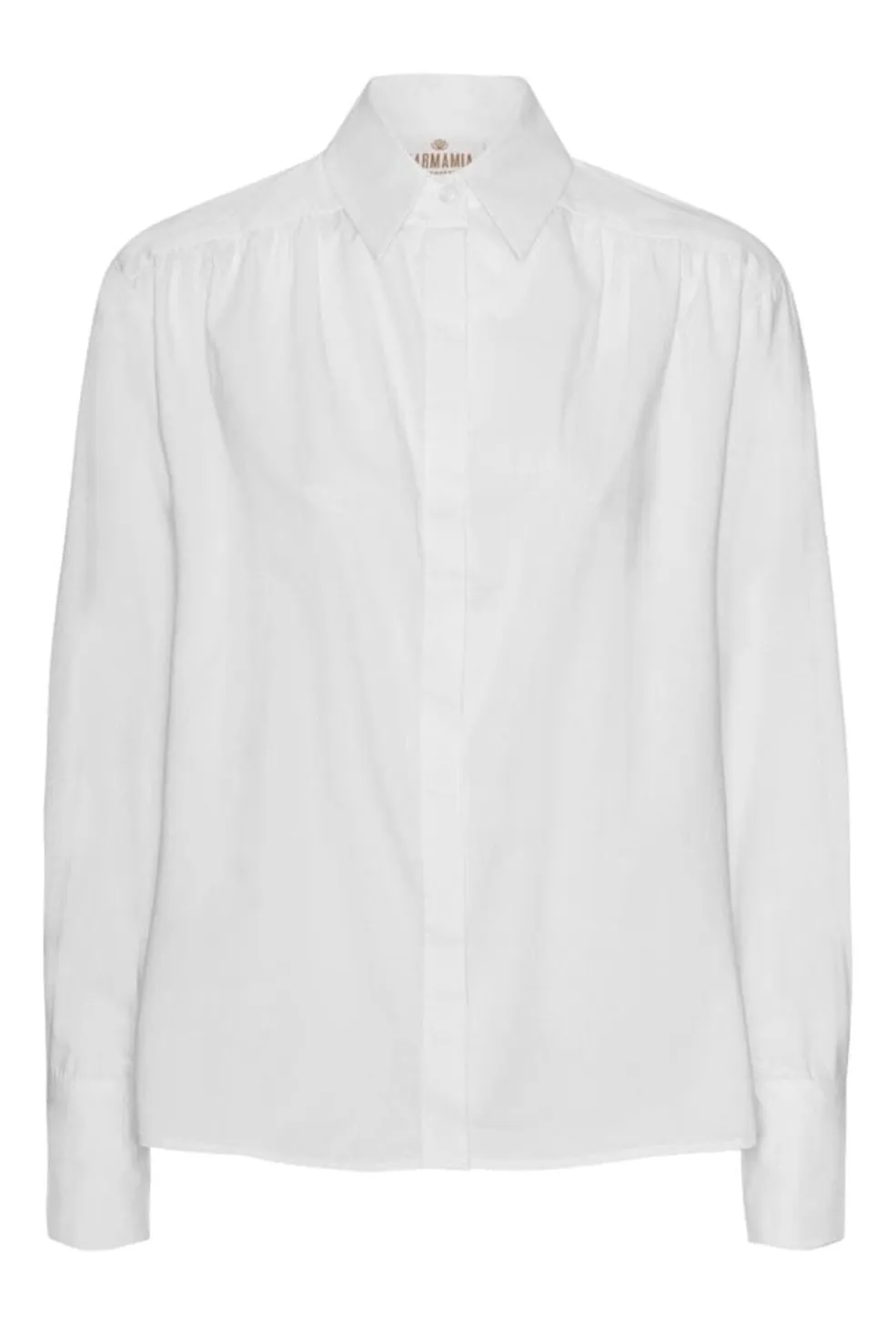 Hvid skjorte med skjortekrave og lange ærmer. Skjorten har fine flæsedetaljer og knapper foran. Den er lavet af en blød blanding af modal og bomuld.