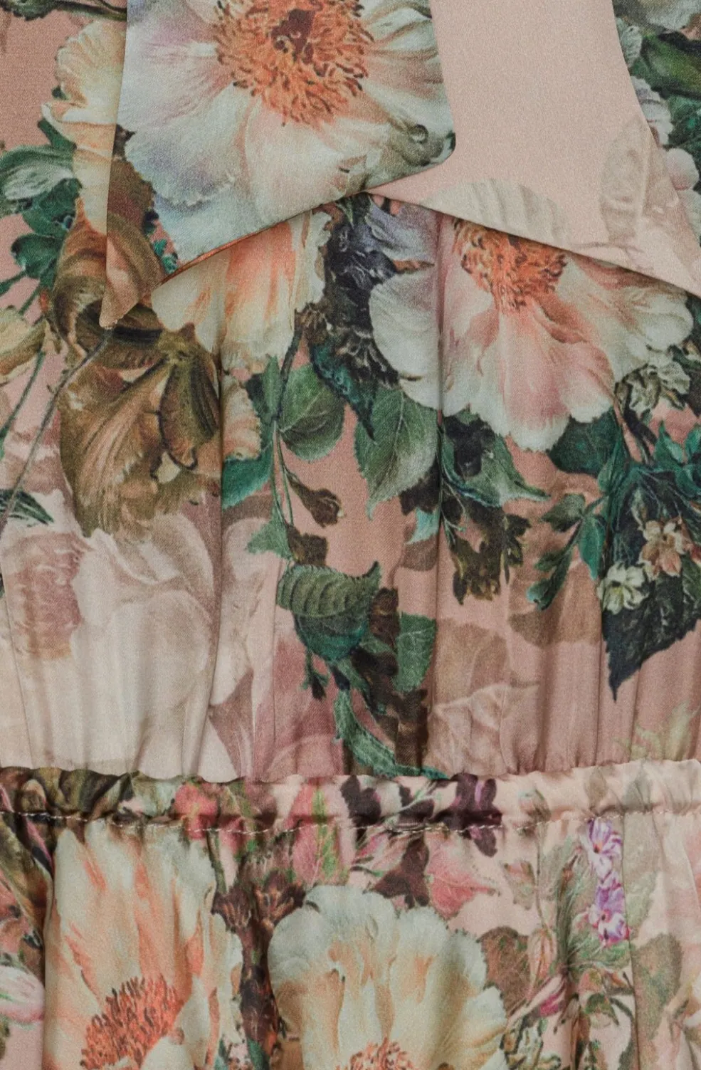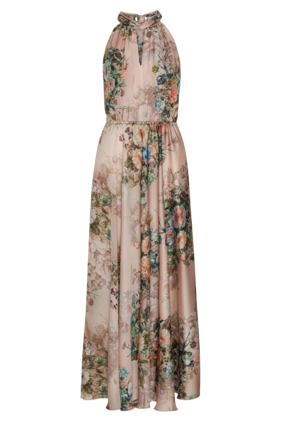 Lang kjole fra Karmamia i lyserød med blomsterprint. Kjolen har halterneck-udskæring og elastisk talje. Den er fremstillet af genanvendt polyester med fokus på holdbarhed.