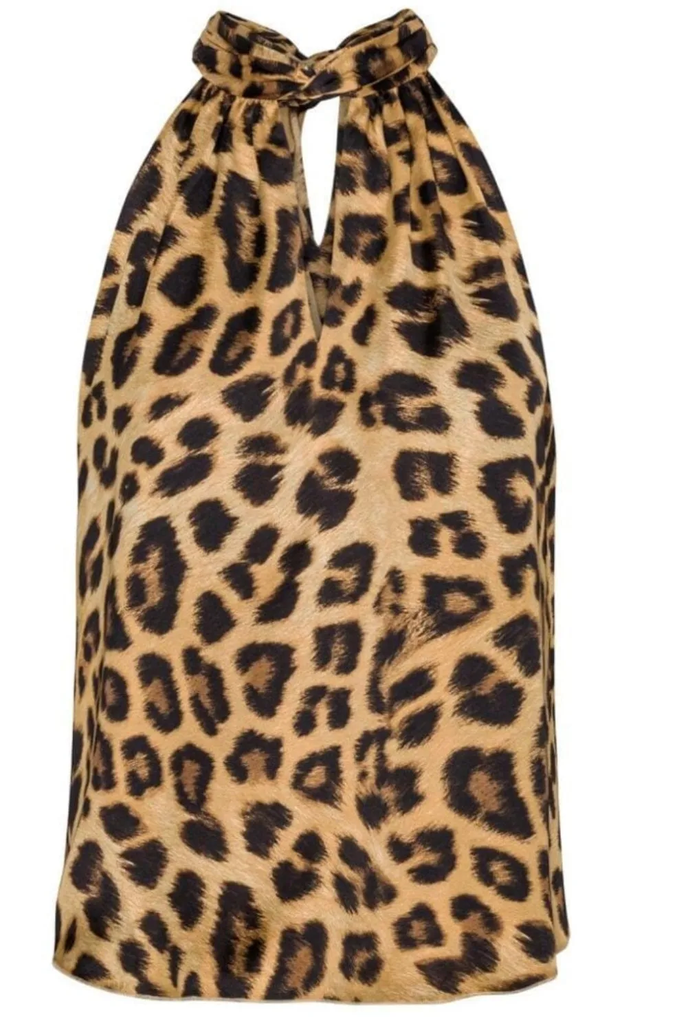 Top fra Karmamia med leopardprint og halterneck-design. Toppen har en løs pasform og en sløjfedetalje ved halsen. Stoffet falder blødt og naturligt.