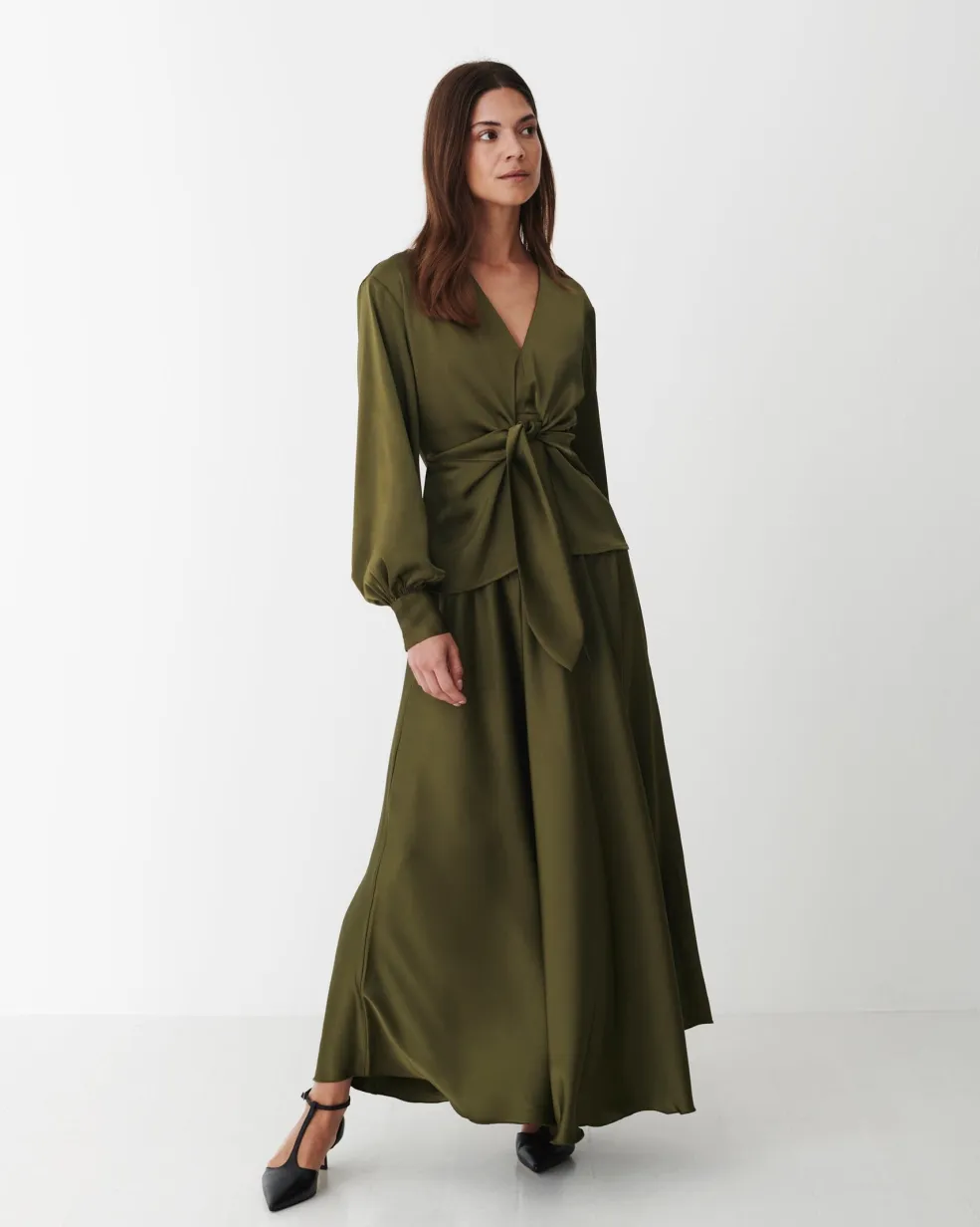Olivengrøn bluse fra Karmamia med V-hals og knudedetalje foran. Blusen har lange ærmer med pufeffekt ved håndleddene og et blankt, glat stof.