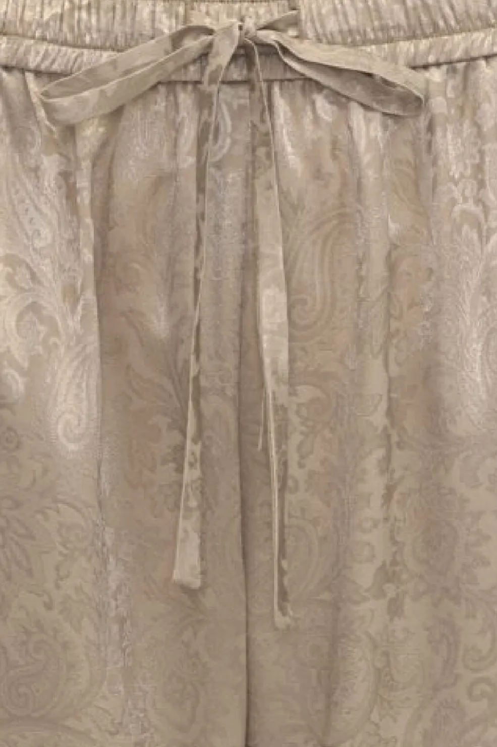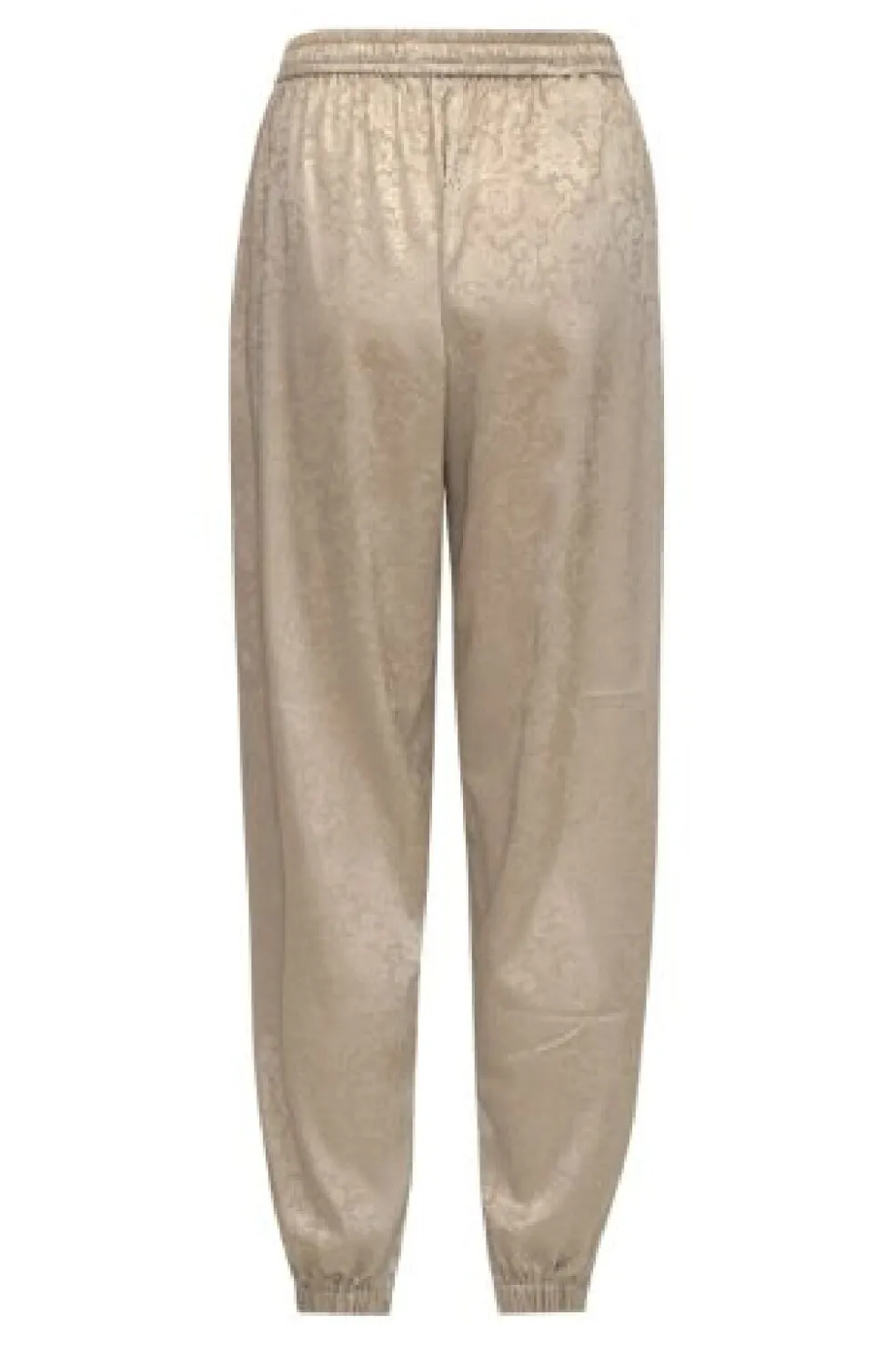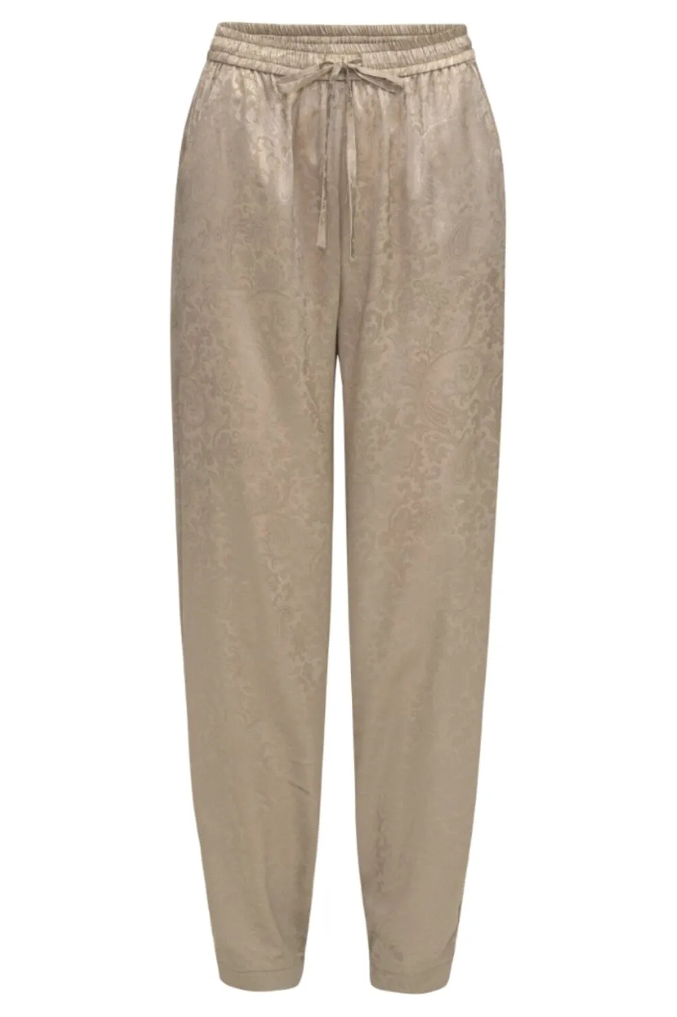 Beige bukser fra Karmamia med paisley-mønster i jacquard. Bukserne har sidelommer, bindebånd i taljen samt elastik ved taljen og anklerne.