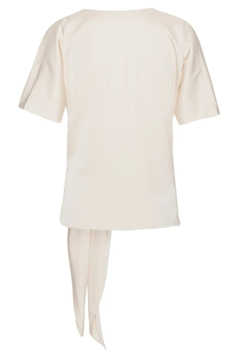 Hvid bluse fra Karmamia i satin terylen med omslagsdesign og bindebånd i taljen. V-halsudskæring og korte ærmer giver blusen et rent og enkelt udtryk.