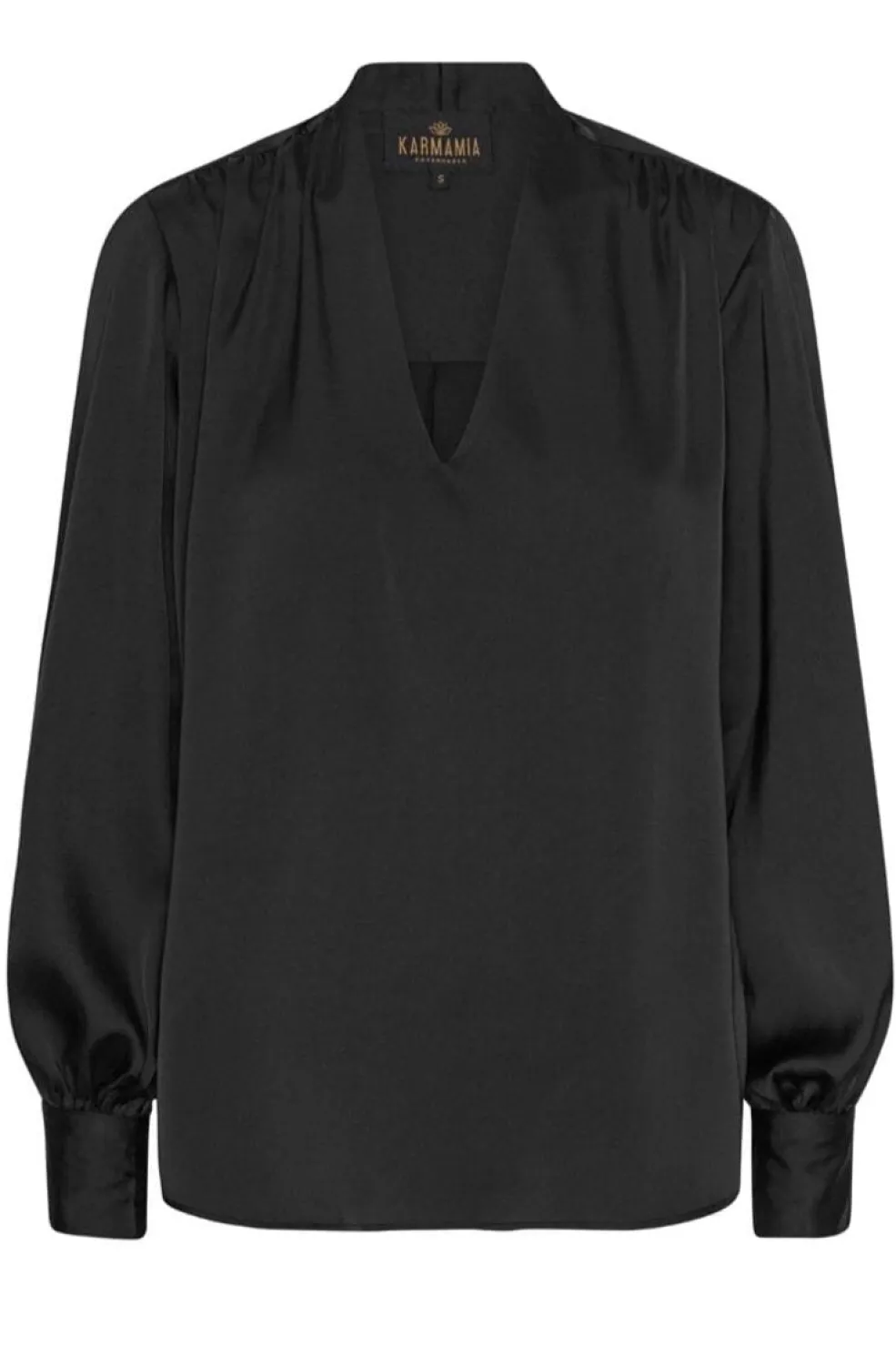 Sort bluse fra Karmamia med en let skinnende overflade. Blusen har V-hals og lange ærmer med rynkedetaljer ved skuldrene.