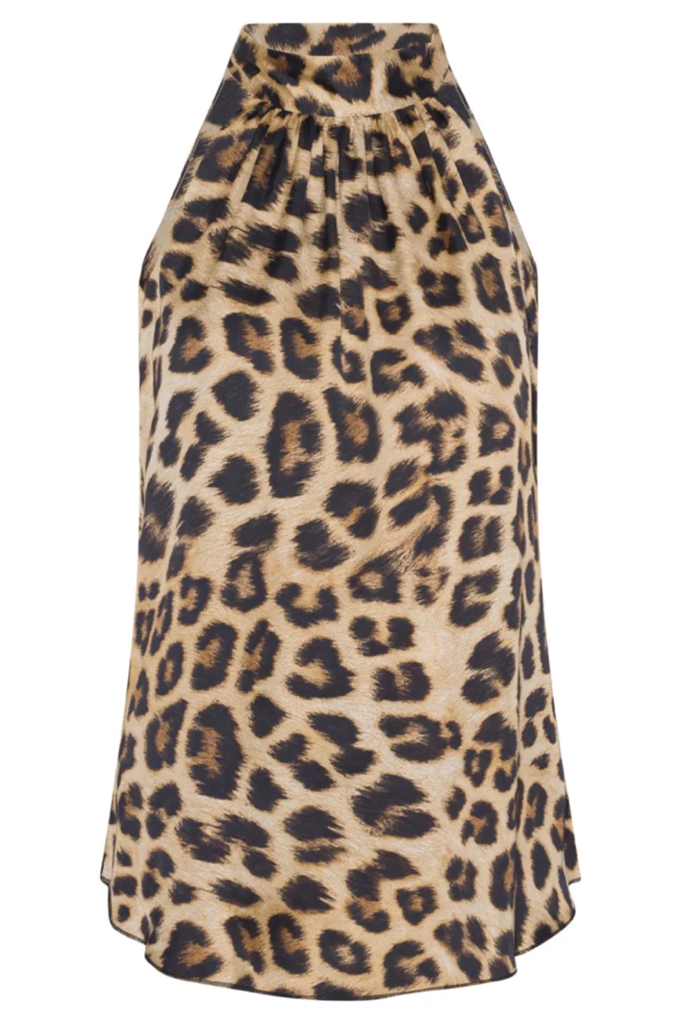 Ærmeløs top fra Karmamia i satin terylen med leopardmønster. Toppen har en høj hals med rynkedetaljer og en løs pasform, der giver god bevægelighed.