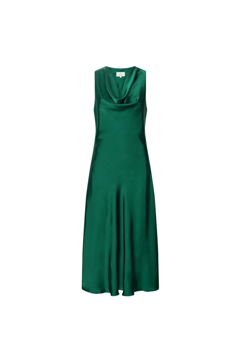 Grøn kjole fra Karmamia i skinnende satin med ankellængde. Kjolen har en draperet halsudskæring og en indsnævret talje, der følger kroppens form.