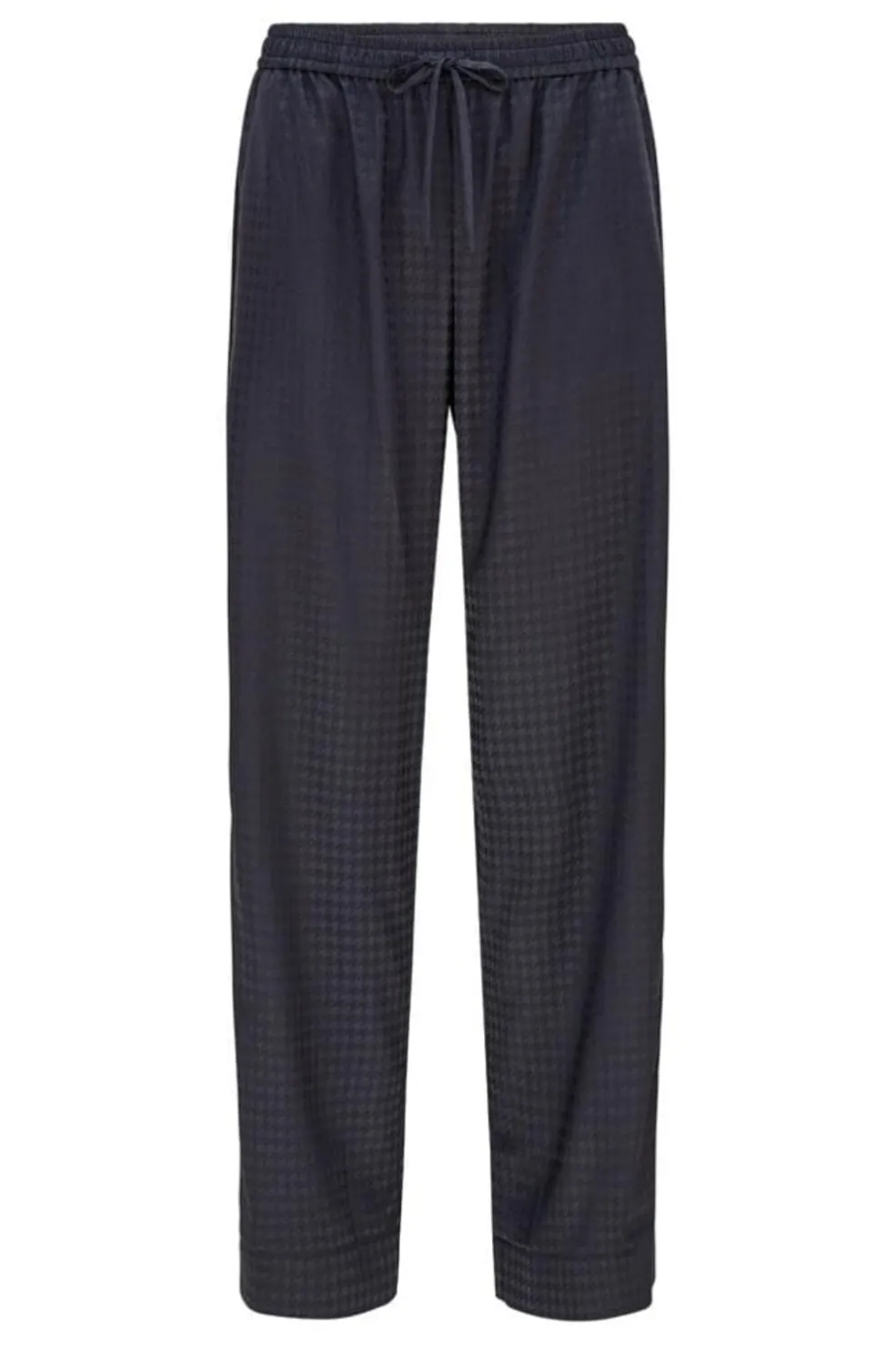 Mørkeblå bukser fra Karmamia med klassisk hundetandsmønster. Bukserne har en regular fit og er fremstillet af genanvendt polyester, som giver et blødt og behageligt stof.