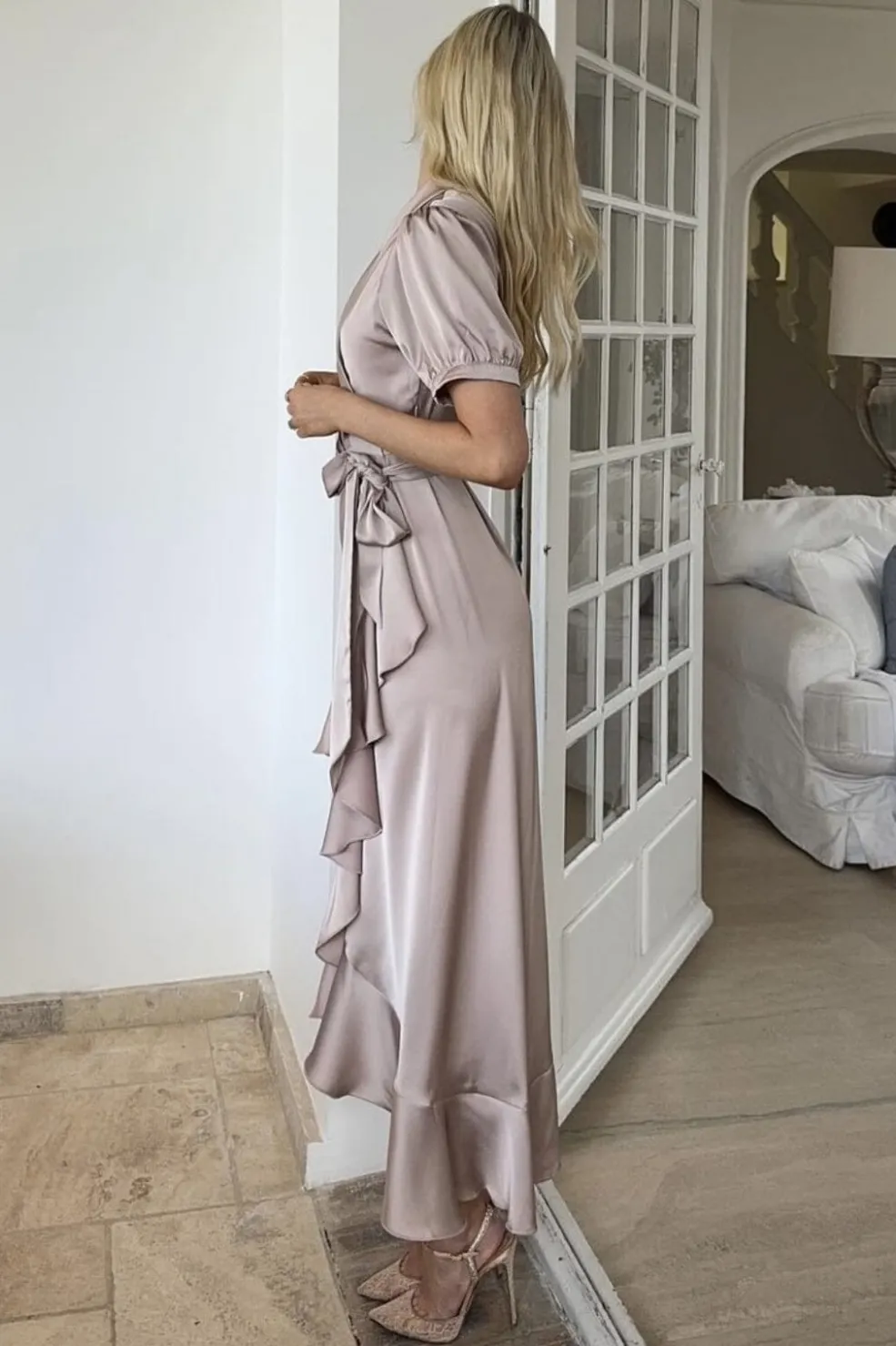 Lyserød slå-om-kjole fra Karmamia i hammered satin. Kjolen har puffærmer og flæsekant langs bunden med bindebånd i taljen.