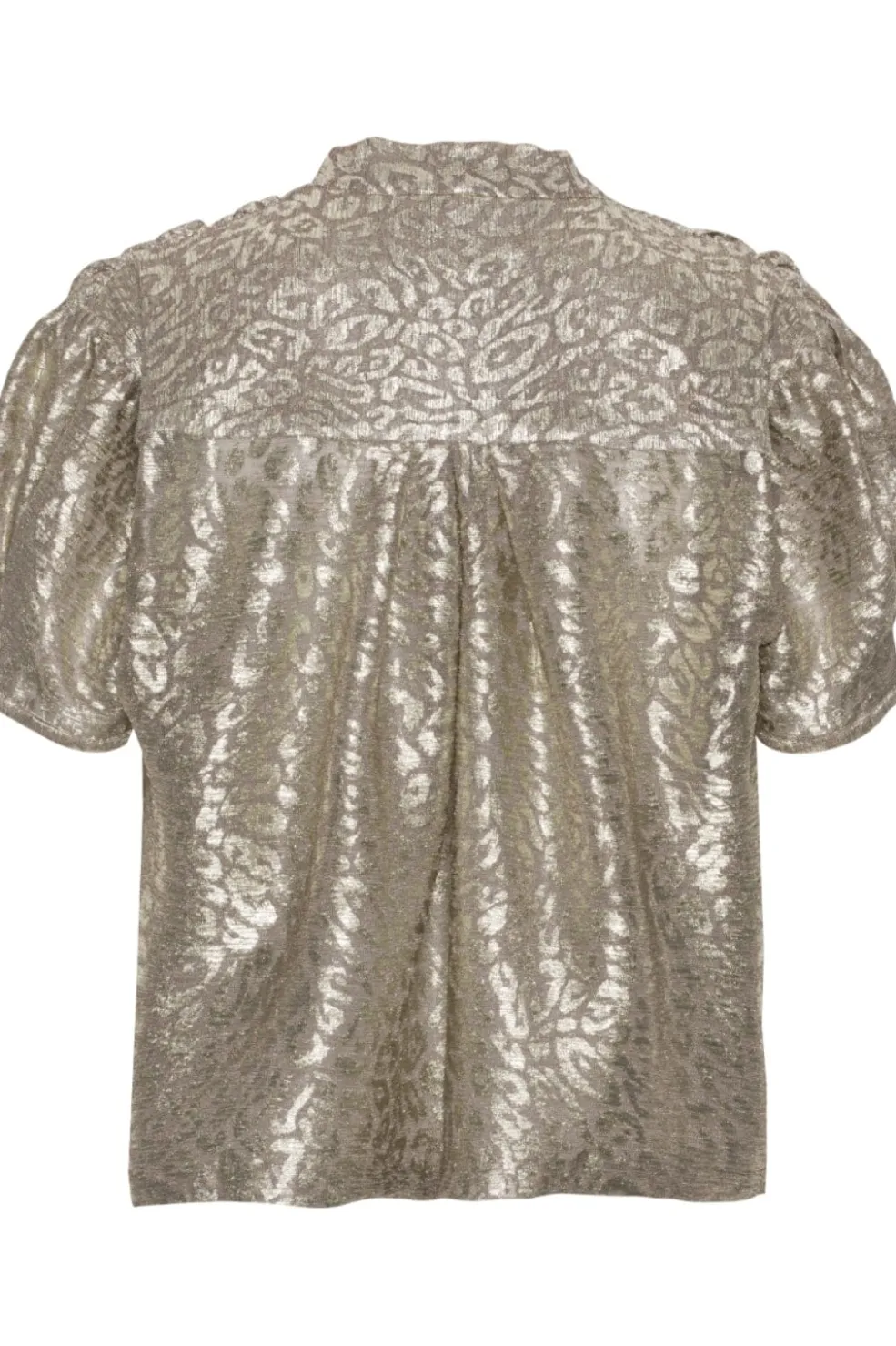 Kort jakke fra Karmamia med dyreprint i guld og lyserød nuance. Den blanke satinoverflade har flæsedetaljer og korte ærmer med v-udskæring.