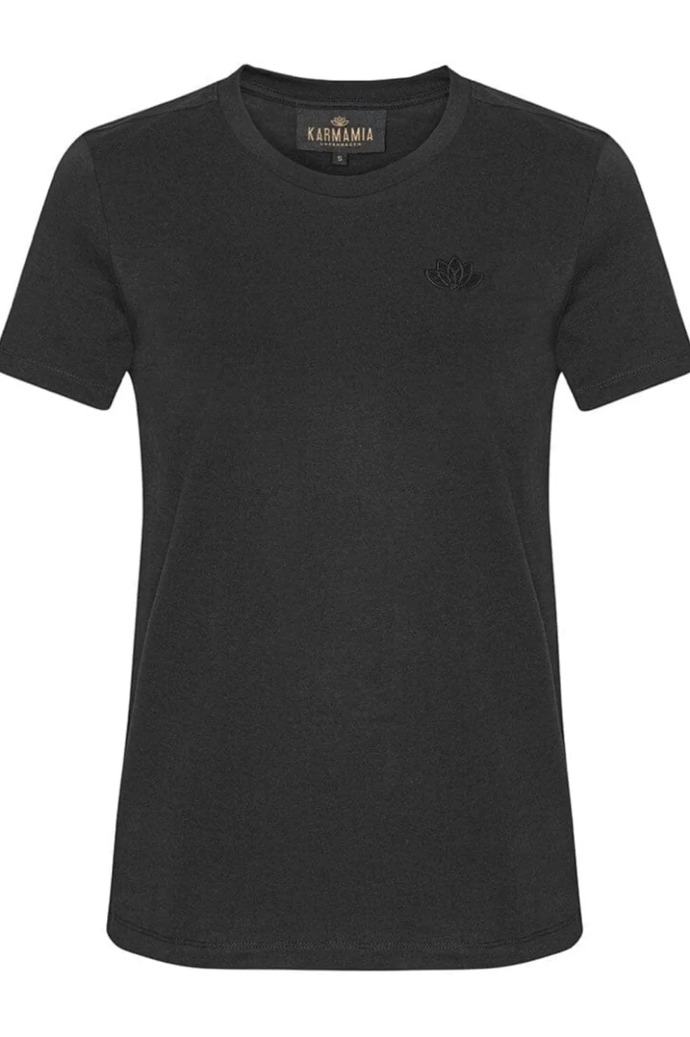 Sort t-shirt fra Karmamia med rund halsudskæring. T-shirten har et broderet lotusblomst-logo på venstre side og er lavet af økologisk bomuld med en behagelig pasform.