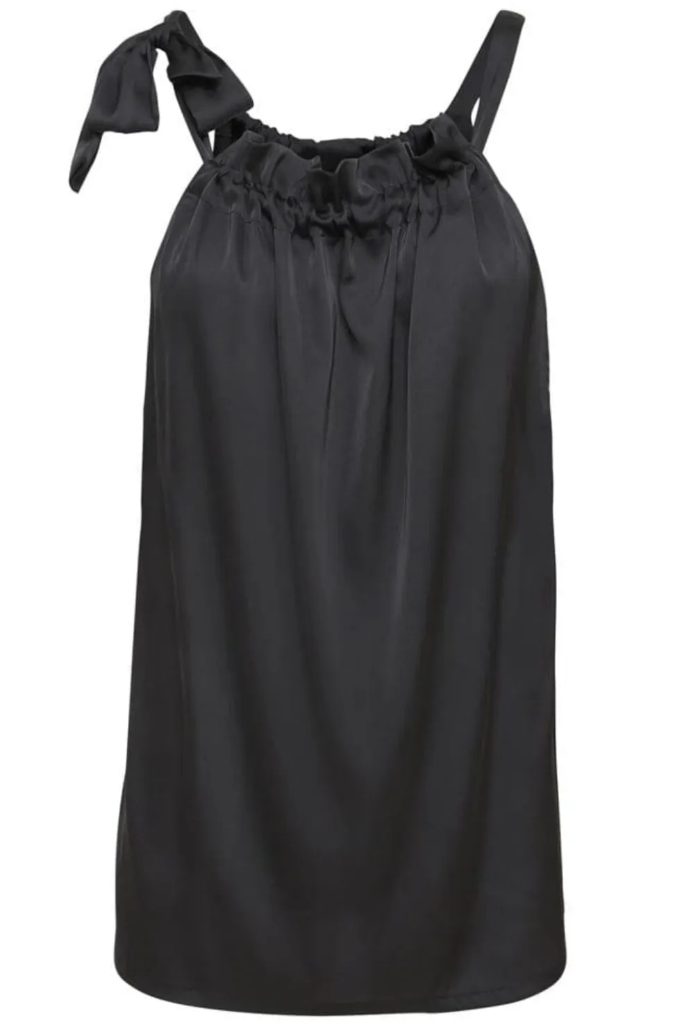 Sort top i satin terylen med rynket halsudskæring. Toppen har flæsedetaljer og en bindesnor på skulderen, der giver mulighed for at justere pasformen.