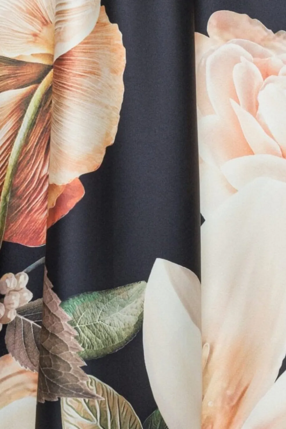 Ankellang nederdel fra Karmamia med store blomster på mørk bund. Skørtet har flæser og dekorative syninger, der giver det karakter.
