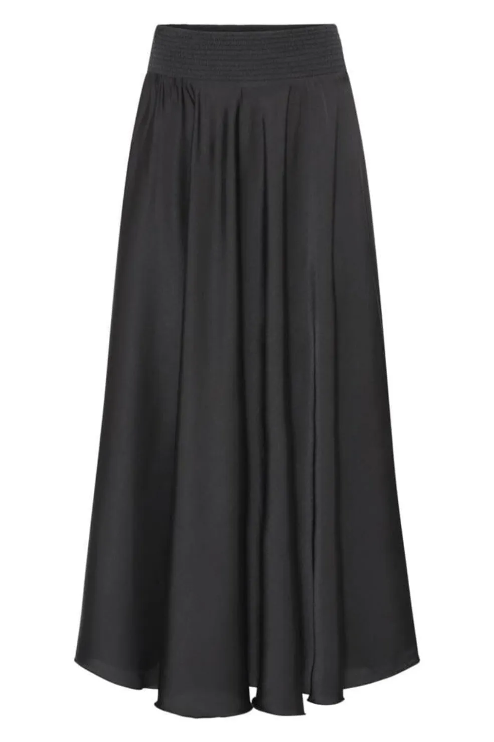Sort nederdel i lækkert fald med smockeffekt i taljen. Den lange model går til midt på læggen og har en løs pasform med flæsedetaljer.