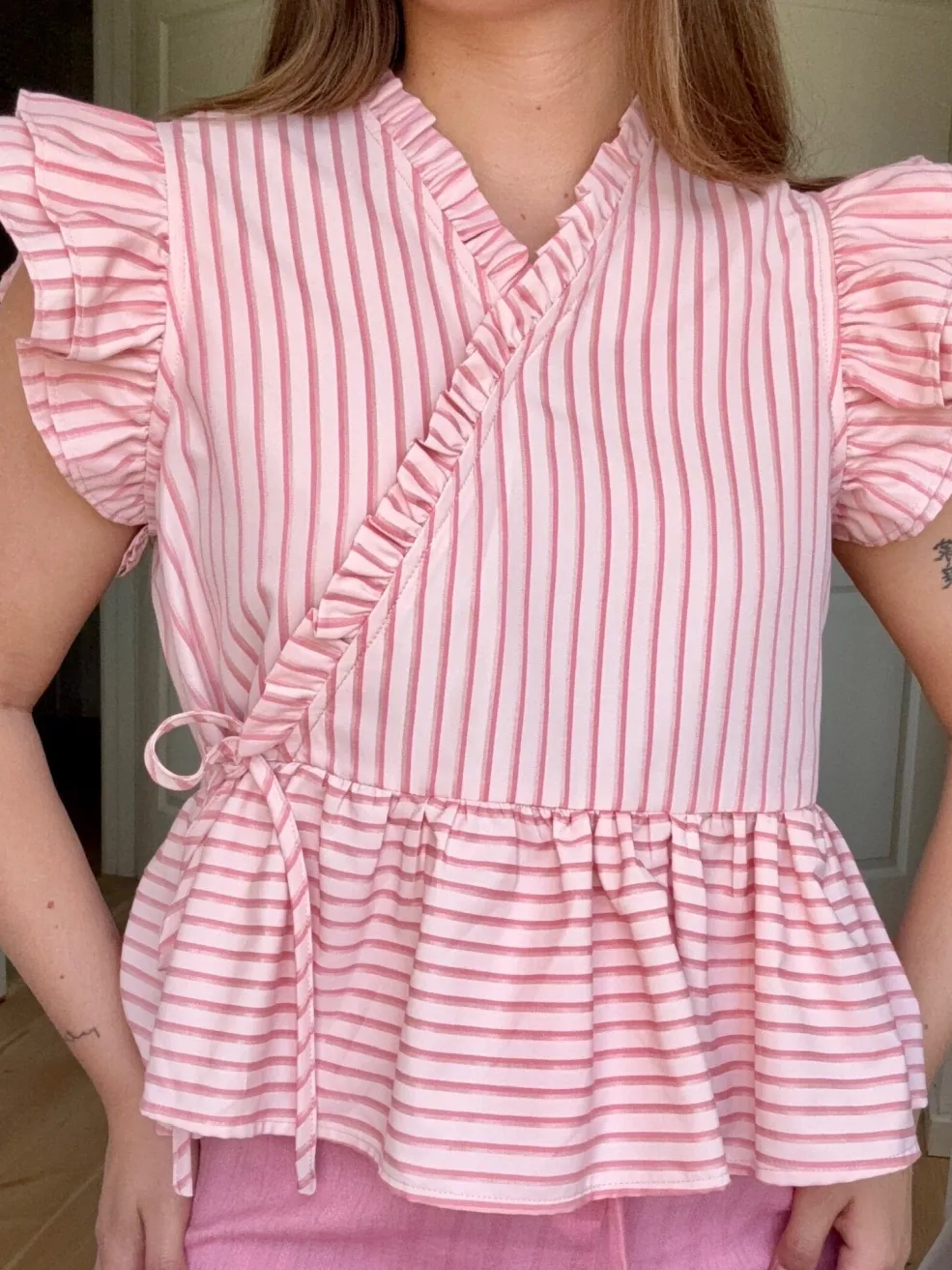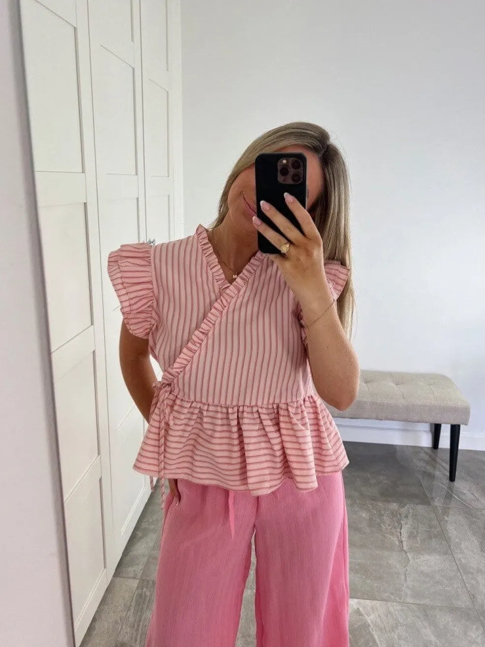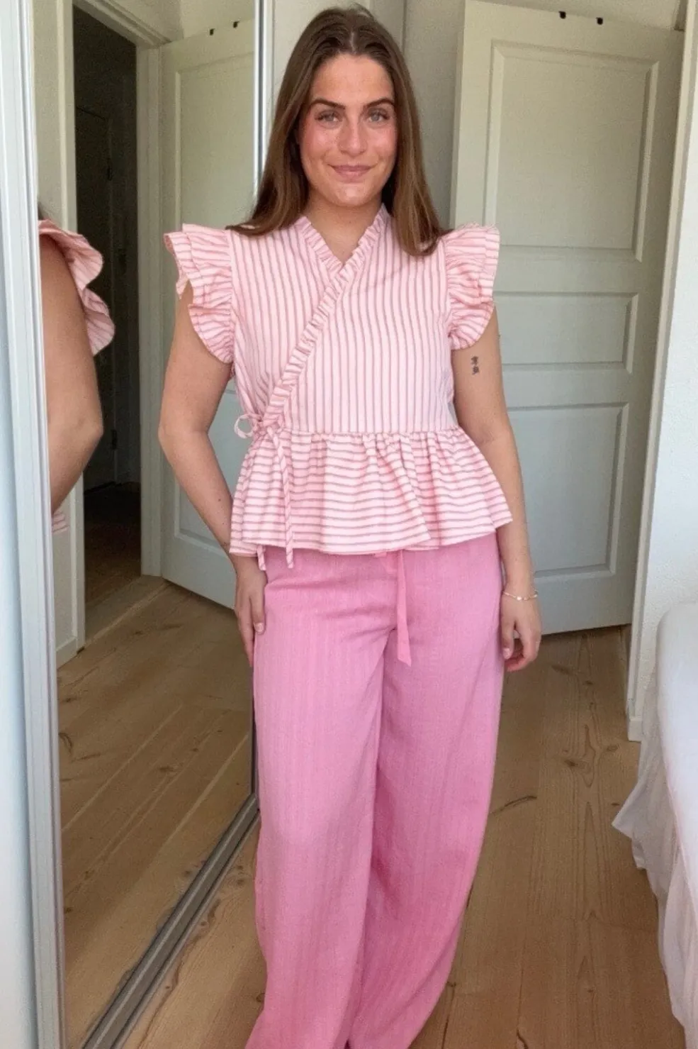 Pink peplum-top fra Dear Molly med hvide striber. Toppen har flæseærmer, V-udskæring og snøredetaljer. Den er syet med peplum-effekt i taljen og har et romantisk design.