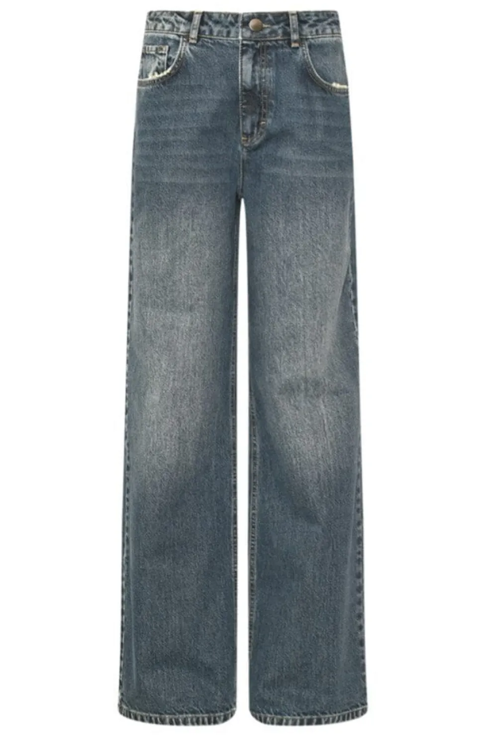 Blå jeans fra Noella med vintagevask. De har brede ben og høj talje. Bukserne lukkes med lynlås og knapper foran, og stoffet har en let vasket overflade, der giver et slidt look.