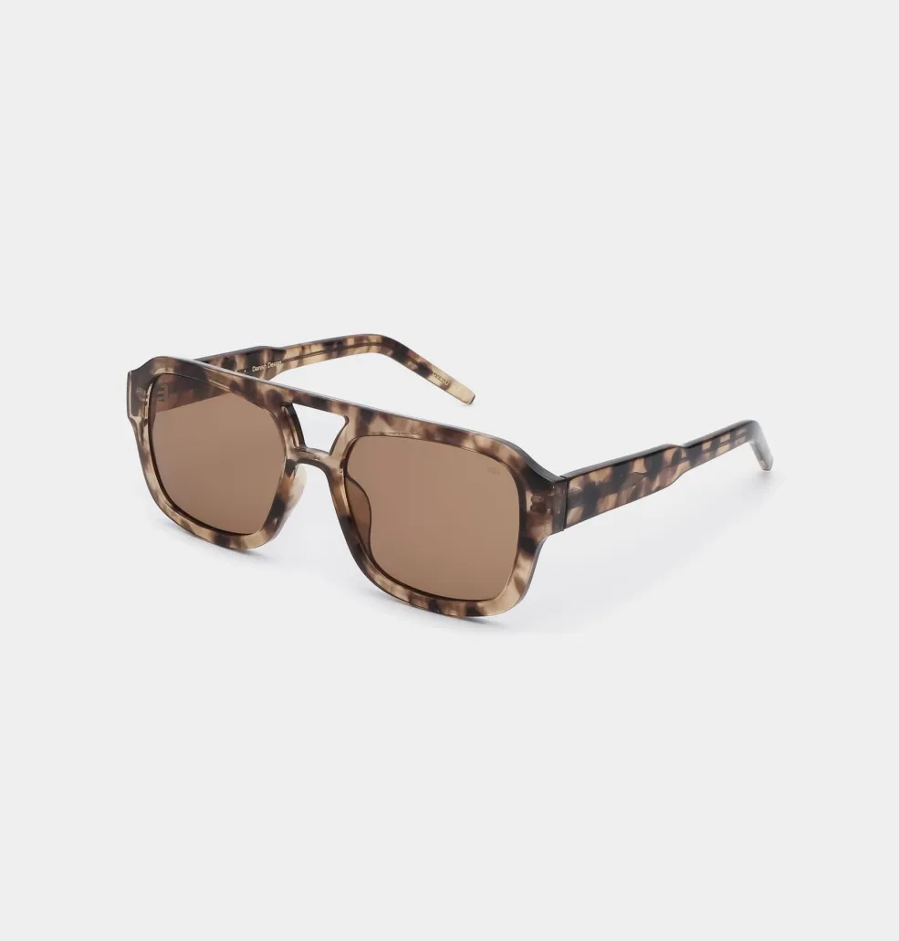 Solbriller fra A. Kjærbede med brun aviator-stel i polycarbonat. Brillen har brune linser med UV 400-beskyttelse og er udstyret med formbare stænger med metalkerne.