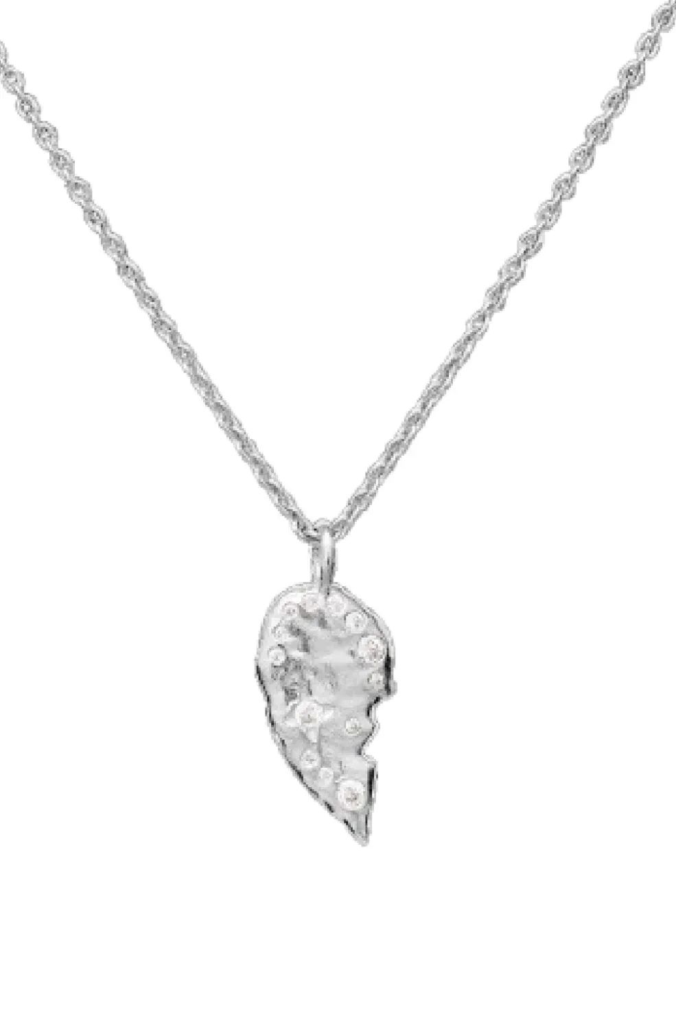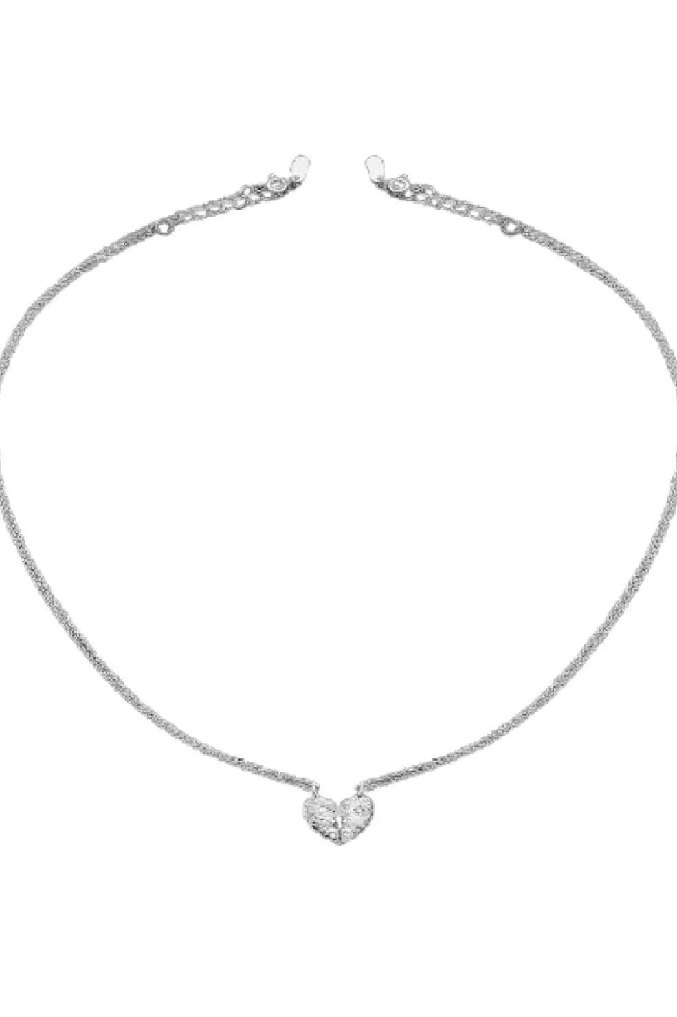 Sølvhalskæde fra Maanesten med et hjertevedhæng i to halvdele. Halskæden har en dobbeltkæde og er fremstillet af genanvendt sterling sølv med en blank overflade.