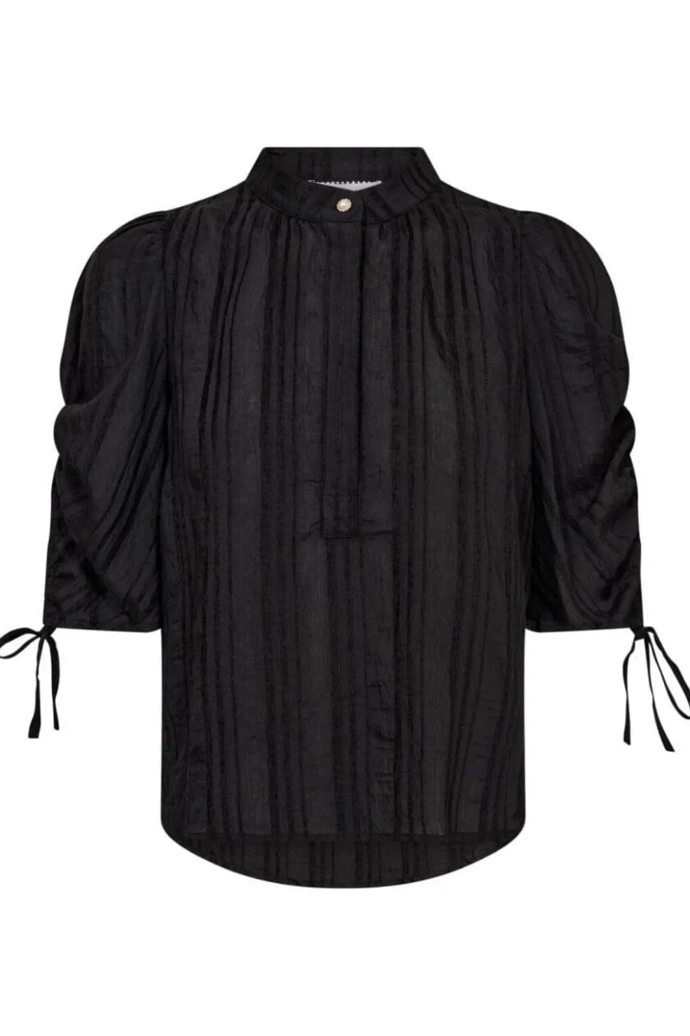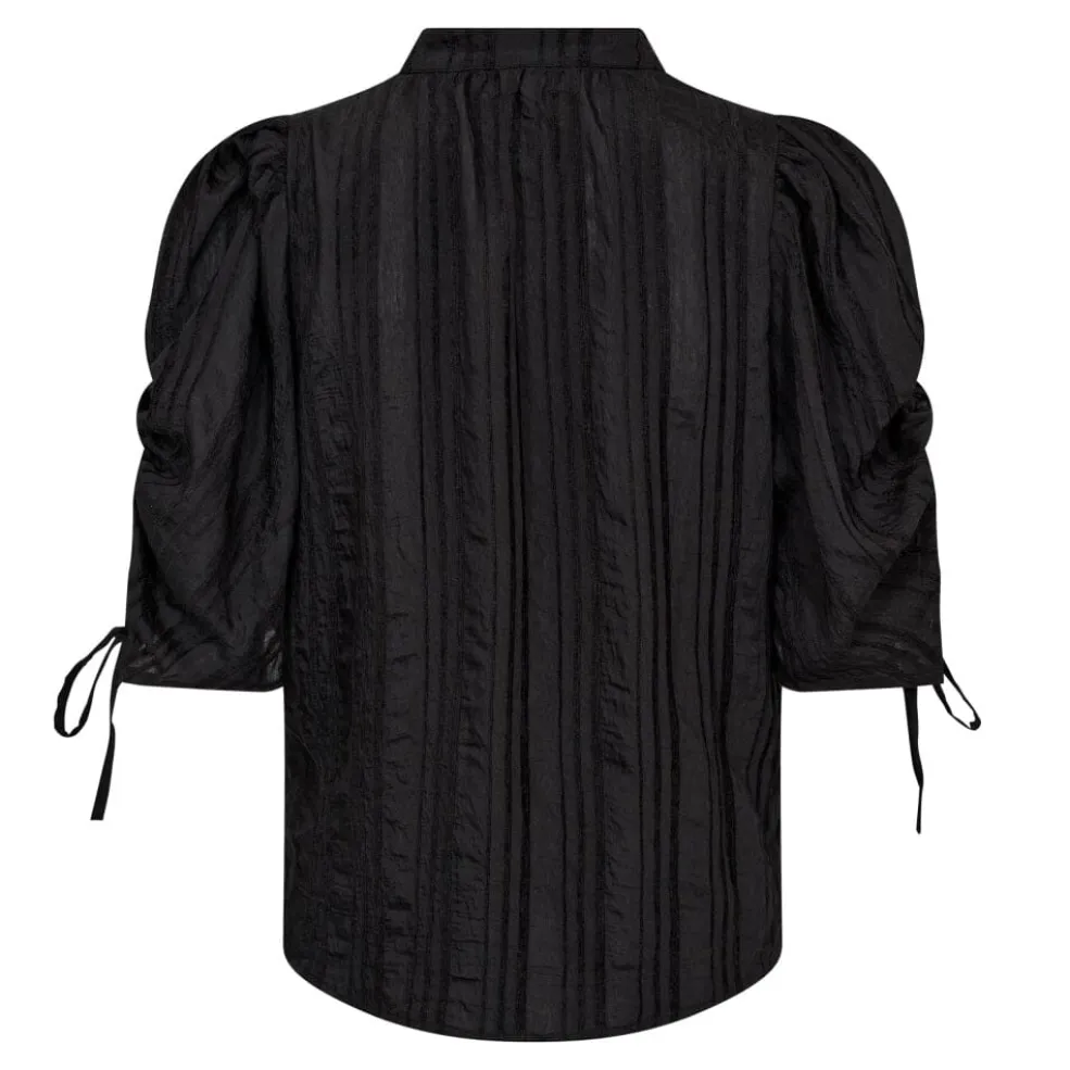 Sort bluse fra Co’Couture med lodrette striber og struktureret overflade. Blusen har puffede korte ærmer med bindebånd og en høj hals med knap foran.