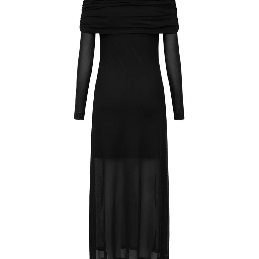 Sort ankellang kjole fra A-View med gennemsigtige ærmer og off-shoulder design. Den gennemsigtige bund skaber et lag-på-lag-look med flotte detaljer.