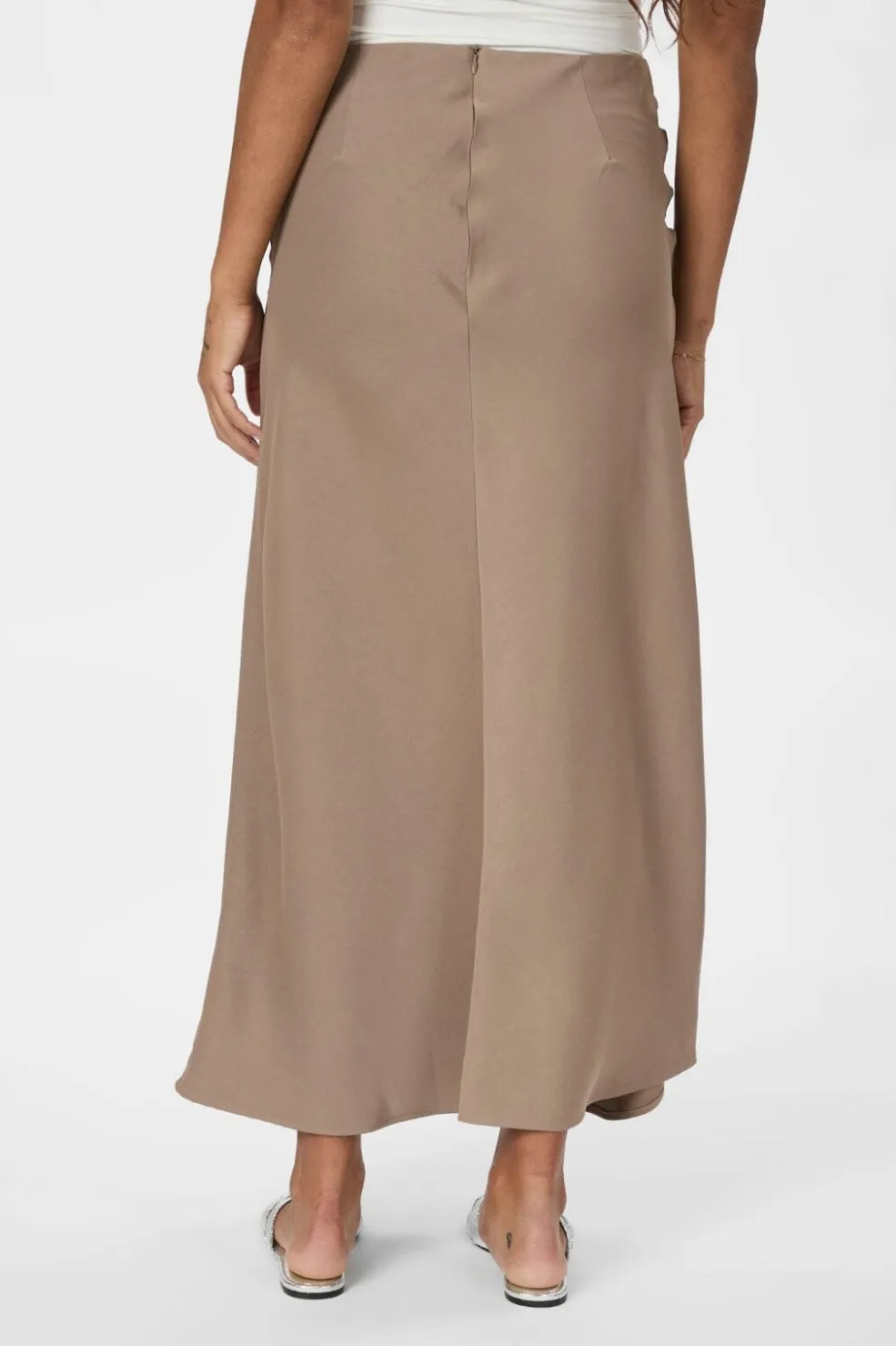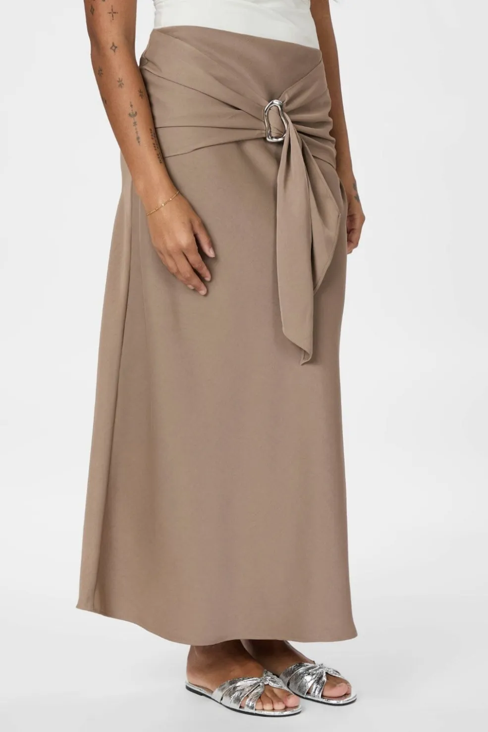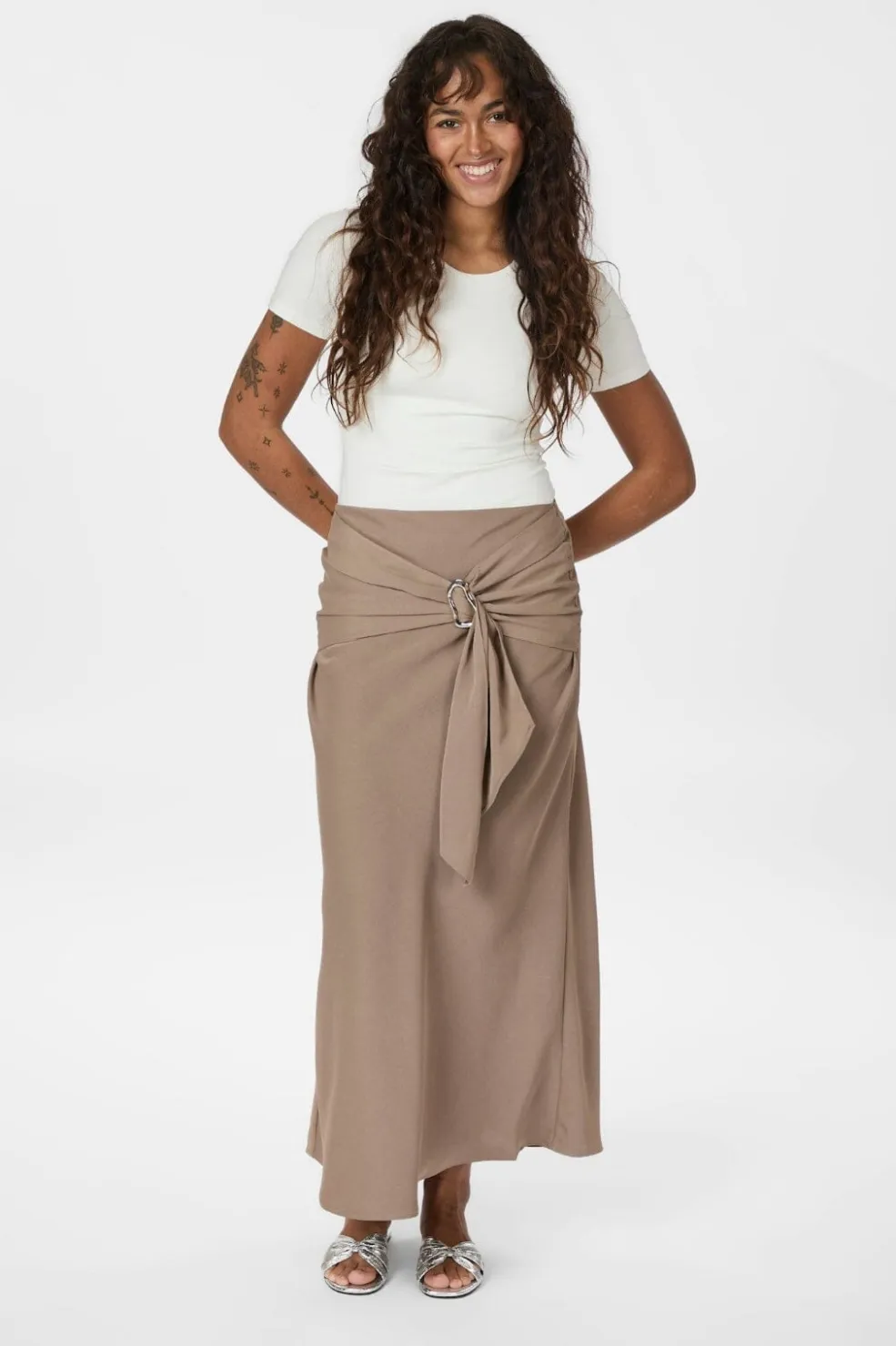 Lang nederdel fra Neo Noir i taupefarvet satin. Den har en slå-om-effekt foran med et sølvfarvet spænde og en knudedetalje ved taljen.