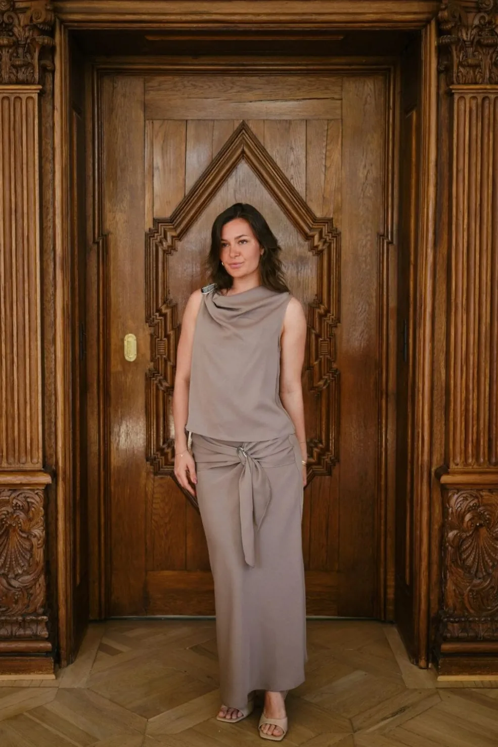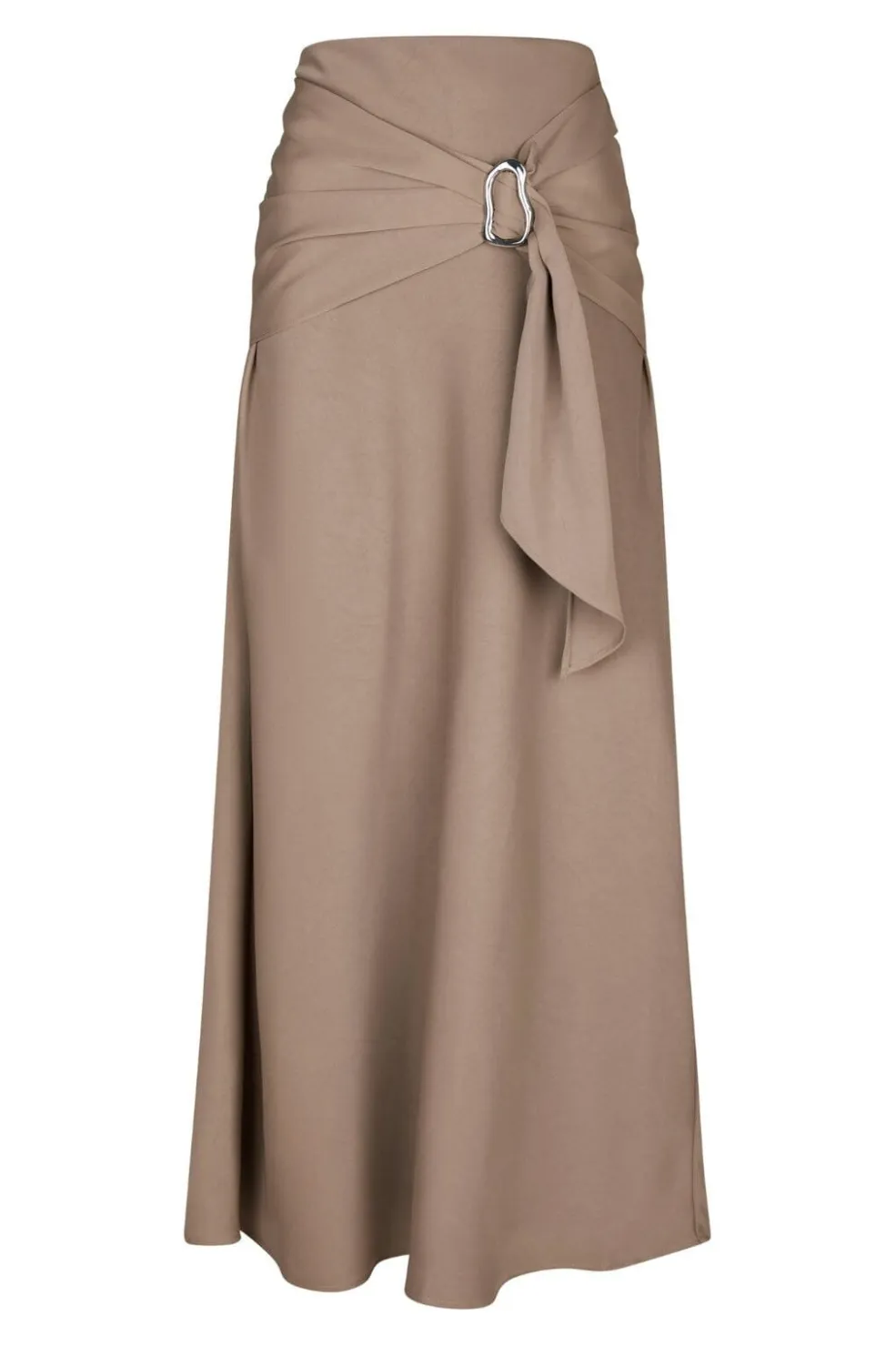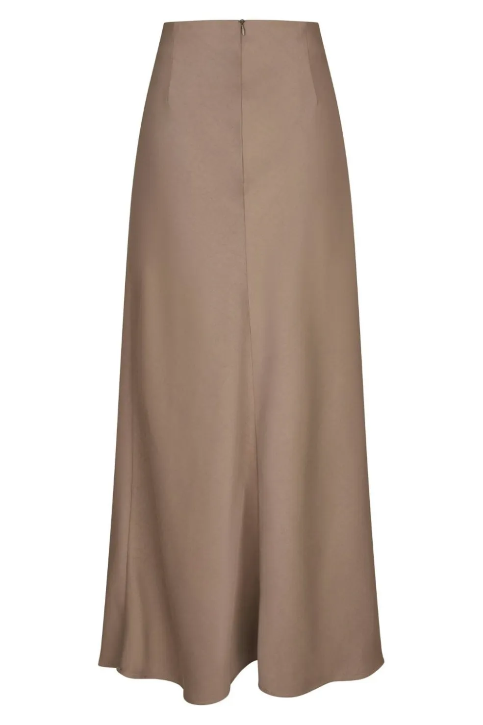 Lang nederdel fra Neo Noir i taupefarvet satin. Den har en slå-om-effekt foran med et sølvfarvet spænde og en knudedetalje ved taljen.