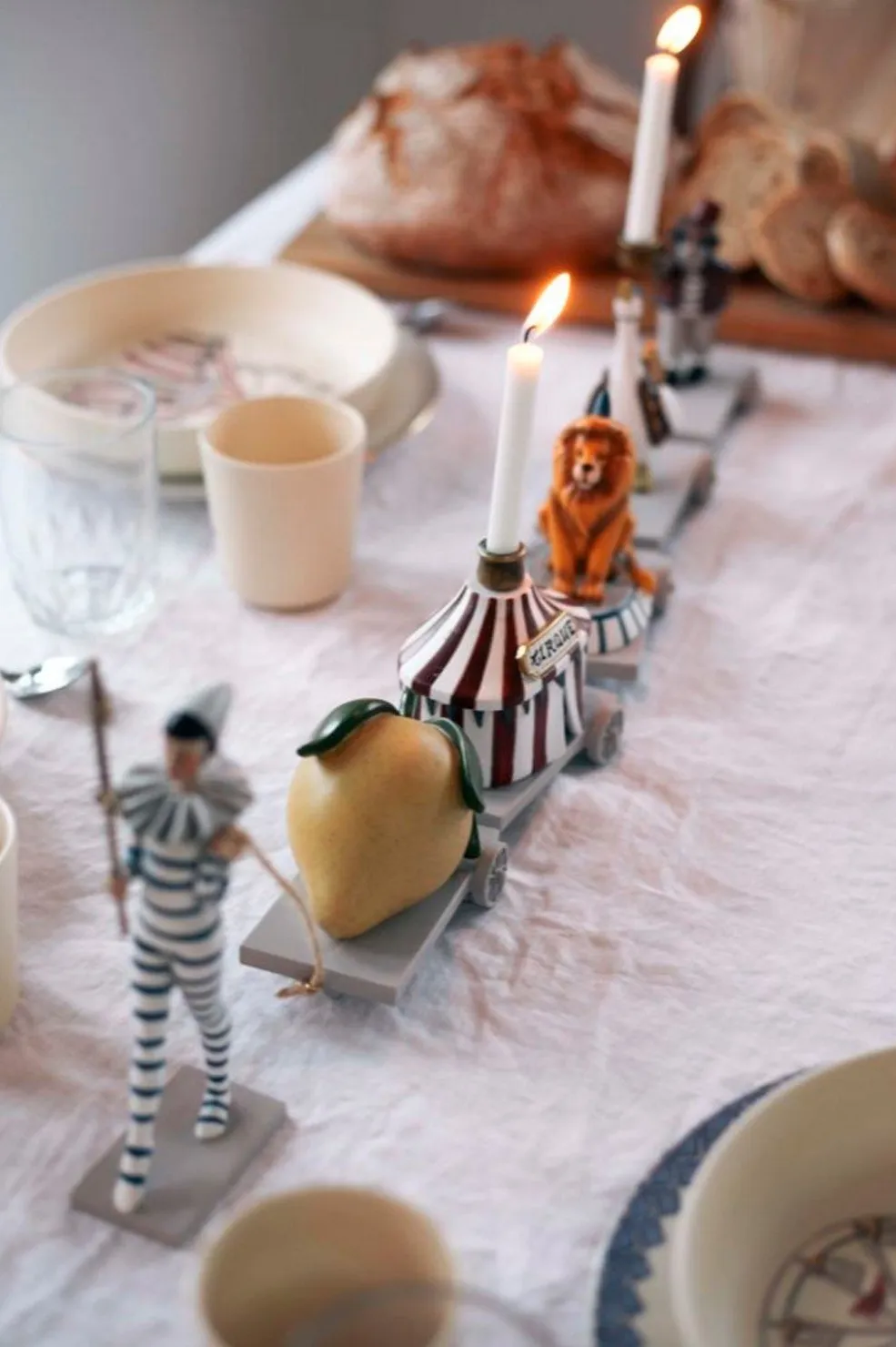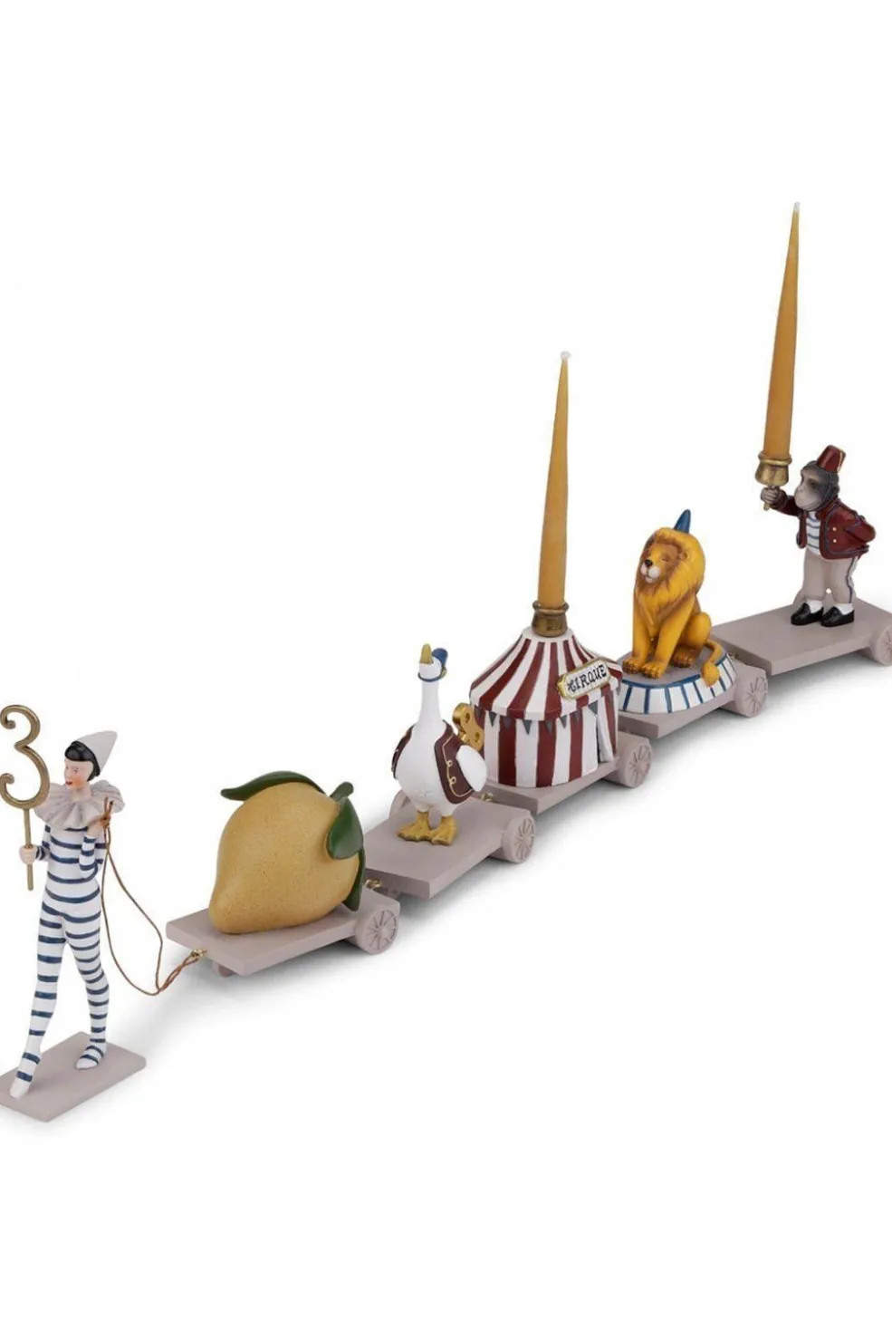Et fødselsdagstog med sammenkoblede vogne i cirkustema. De små vogne har lysholdere og udskiftelige tal til at markere alderen. Toget består af en klovn, en gås, et cirkustelt, en løve og en abe.