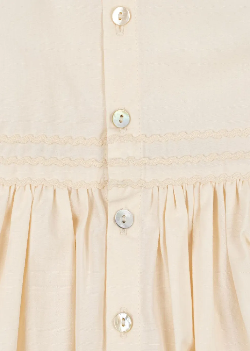 Et festsæt i lys eggnog-farve fra Konges Sløjd med kjole og bloomers. Sættet har fine flæser ved skuldrene, blonder og broderede detaljer.