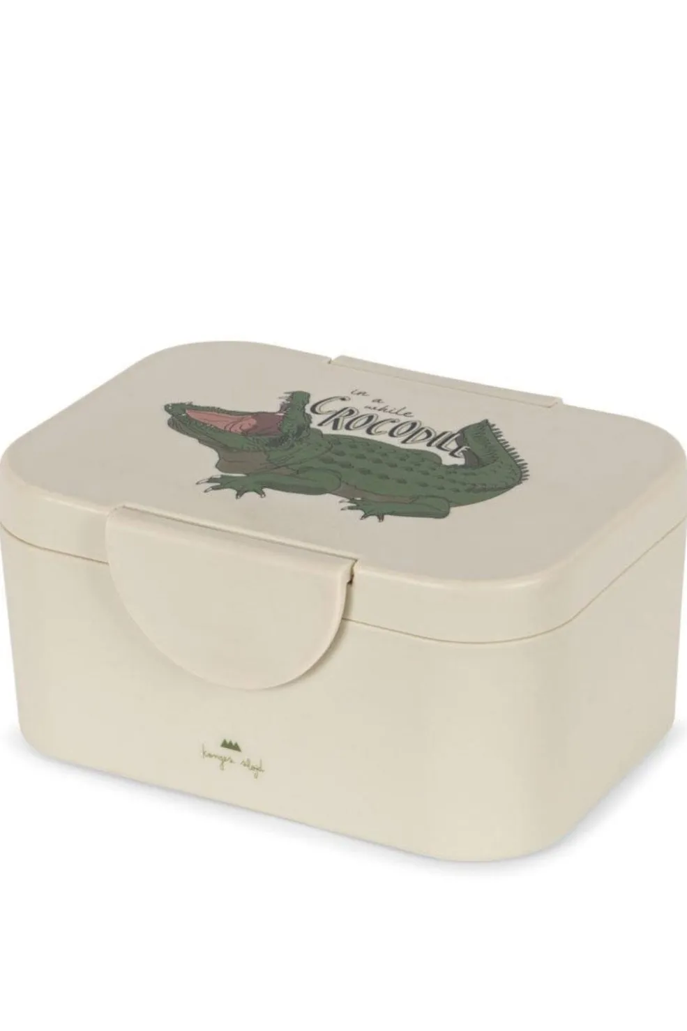 Madkasse fra Konges Sløjd i lys beige farve med krokodillemotiv og teksten ‘In a while, Crocodile’ på låget.