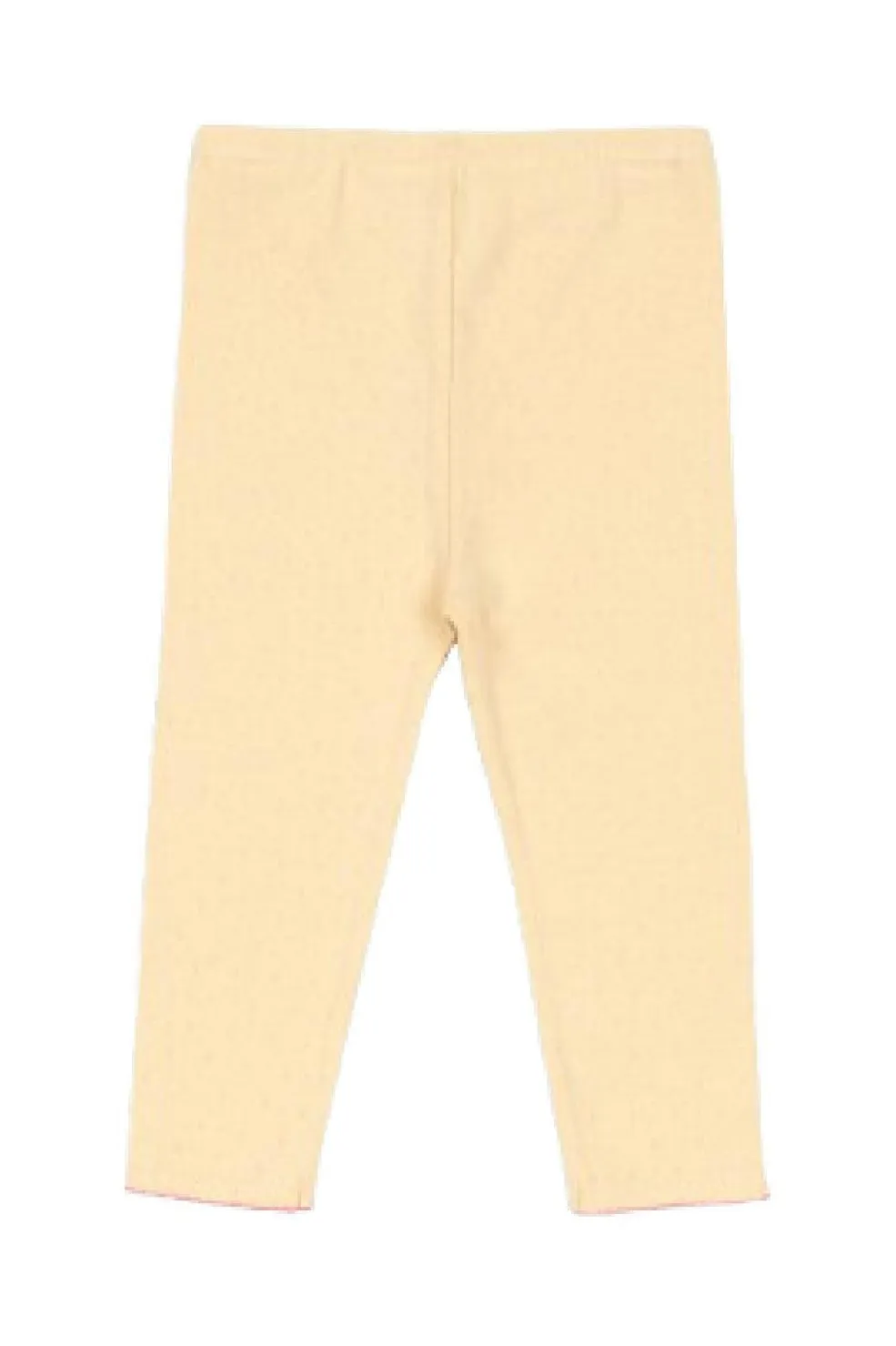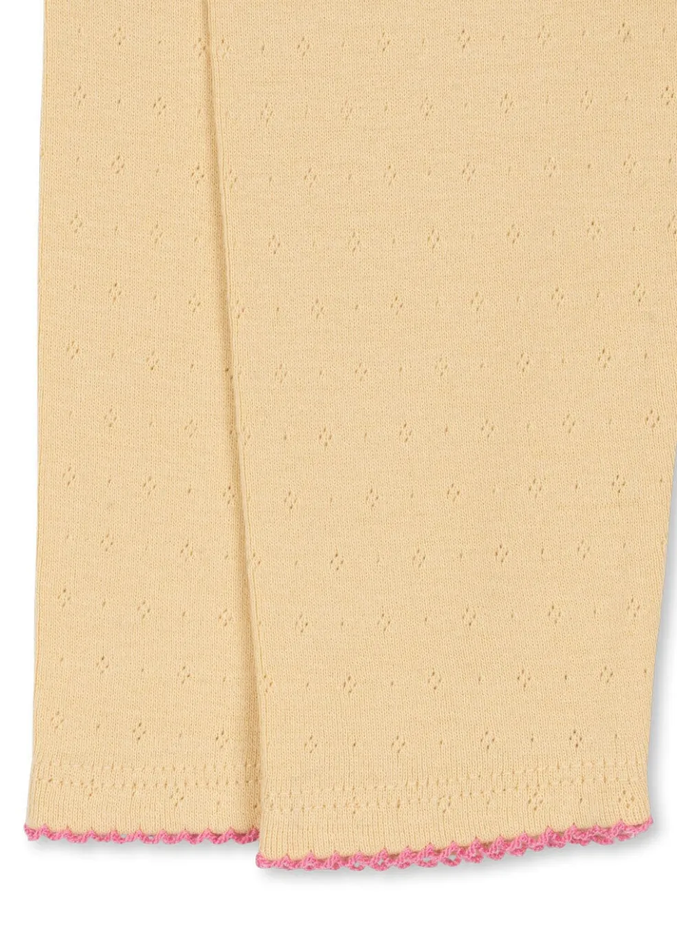 Bukser fra Konges Sløjd i en gylden farve. De har en elastisk talje og er fremstillet af økologisk bomuld med en dekorativ pink kant nederst på benene.