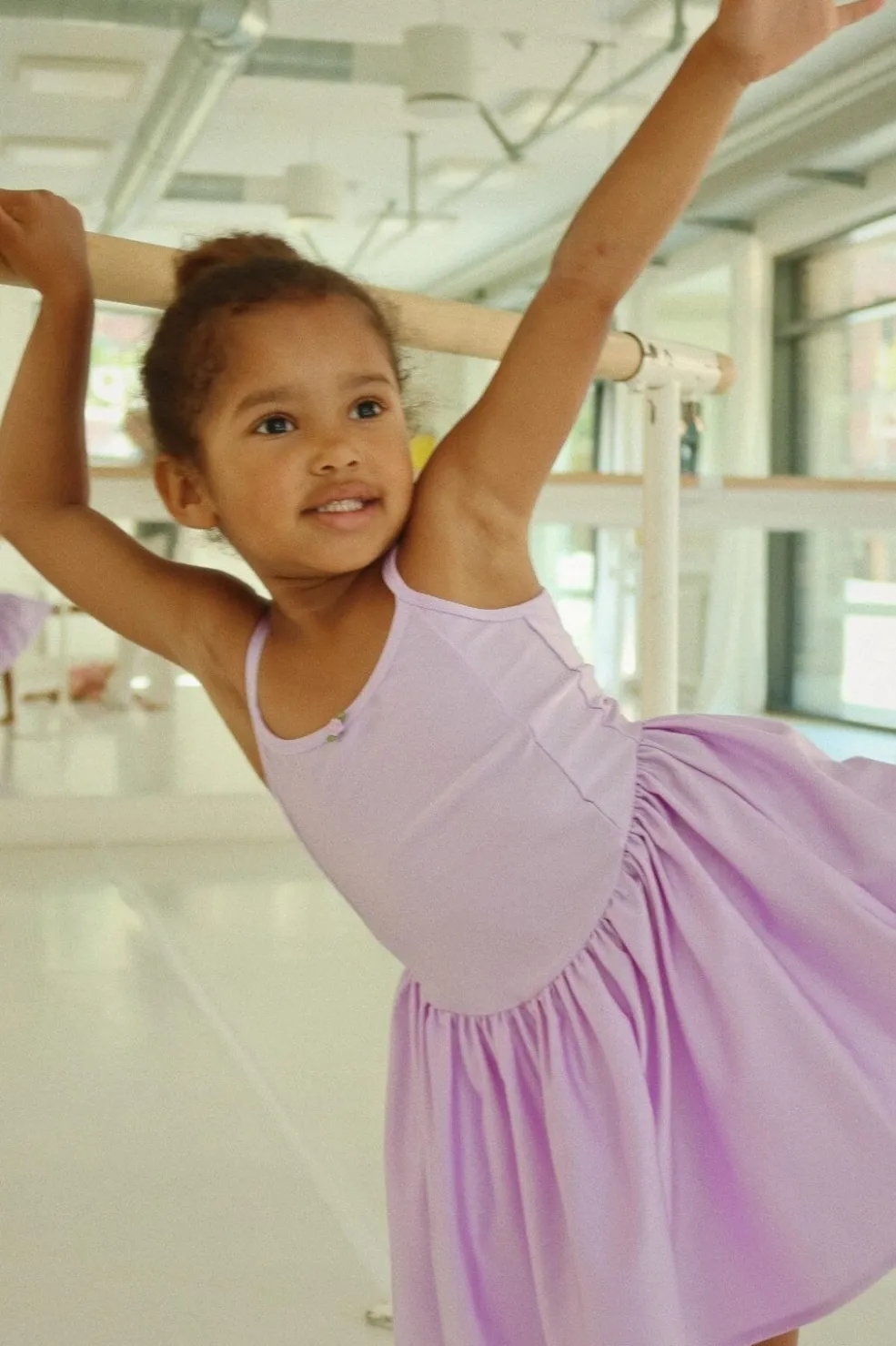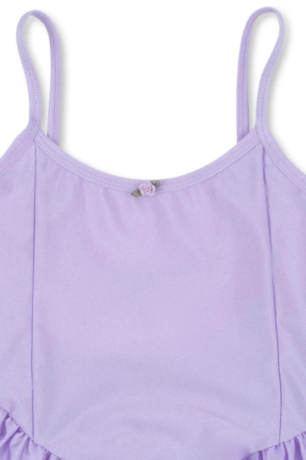 Lavendel lilla kjole fra Konges Sløjd med plisseret skørt og tynde stropper. Den har en rund halsudskæring og en lille rose som pynt på forsiden.