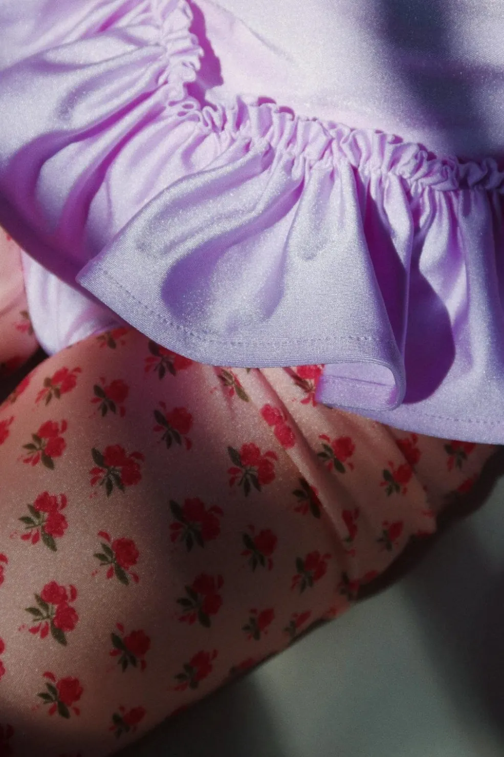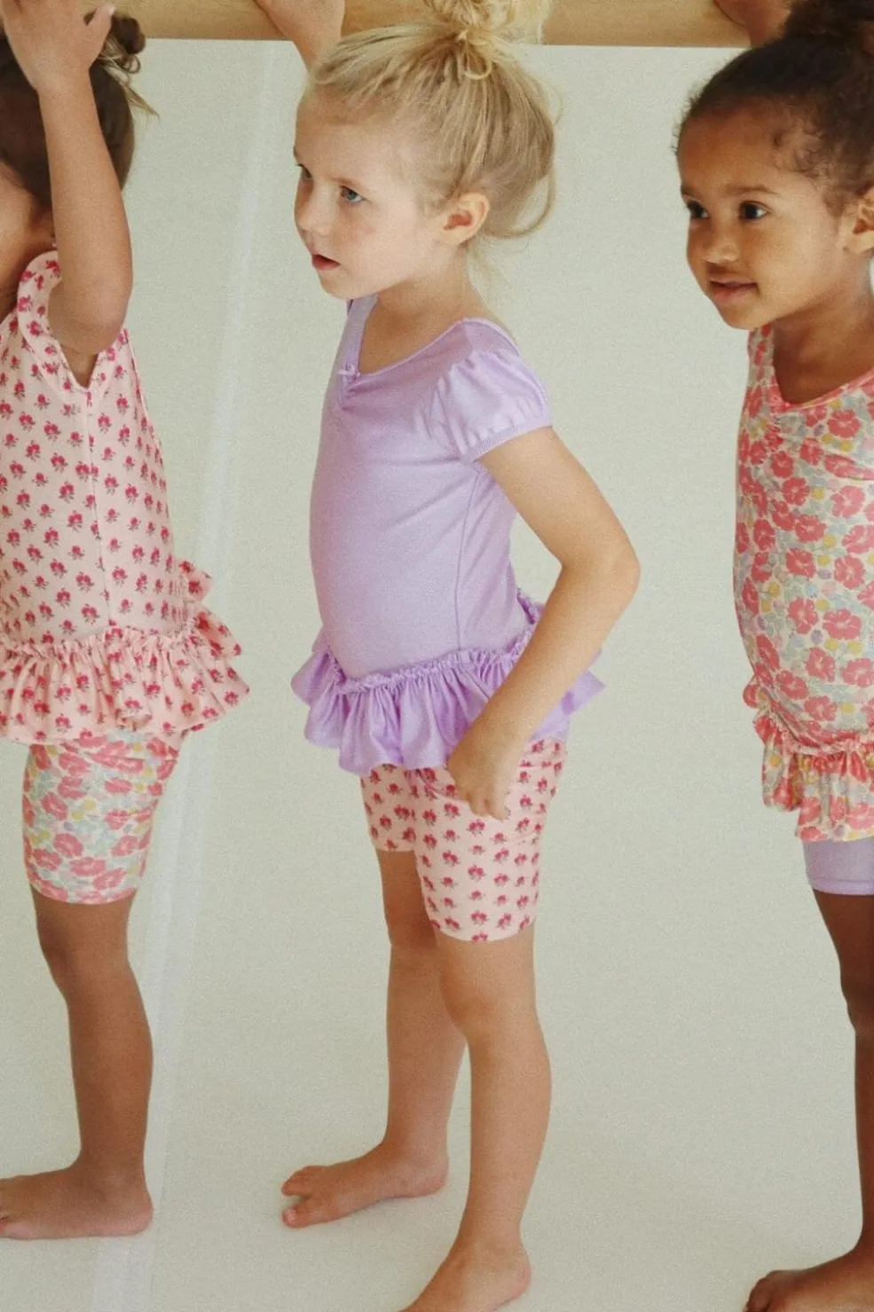 Det lyserøde stof har et fint rosemønster og flæsekanter, der giver leggingsene et sommerligt udtryk.