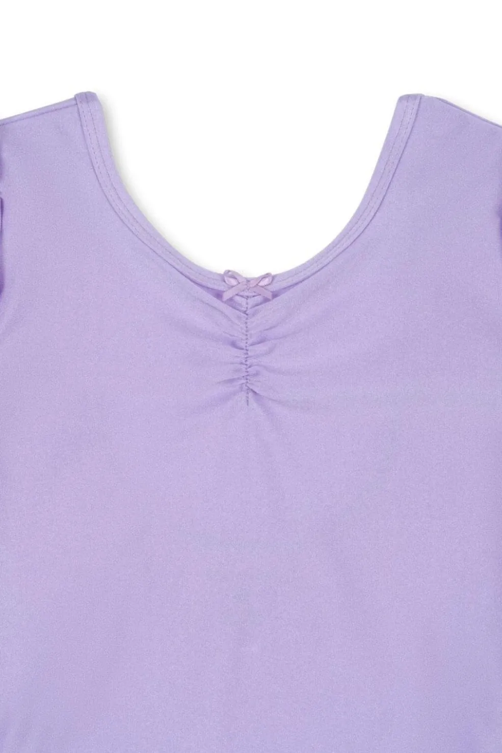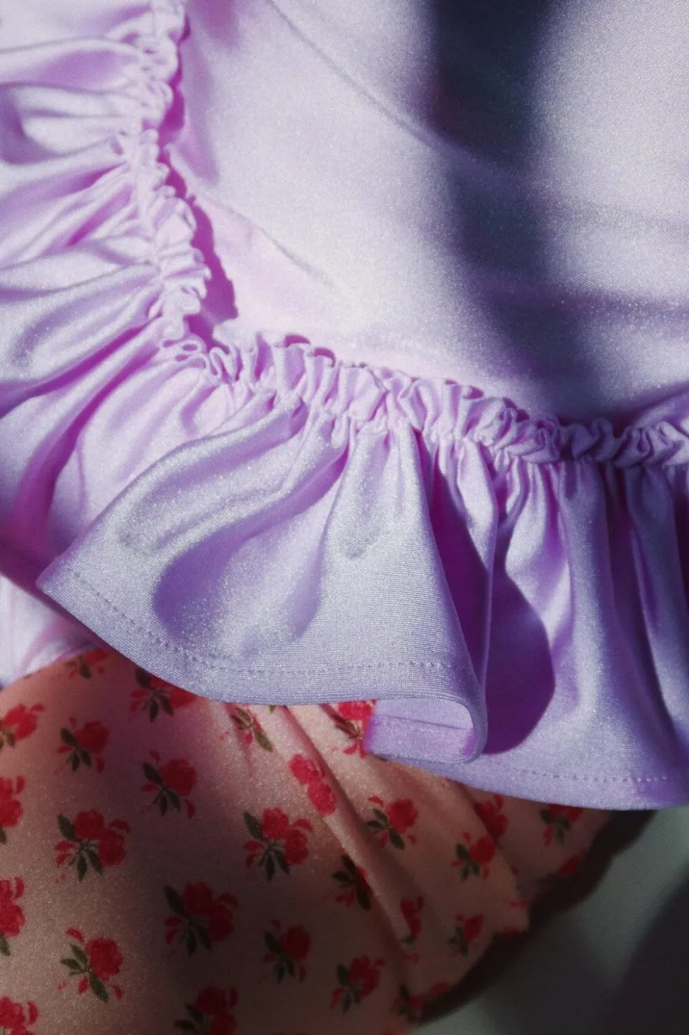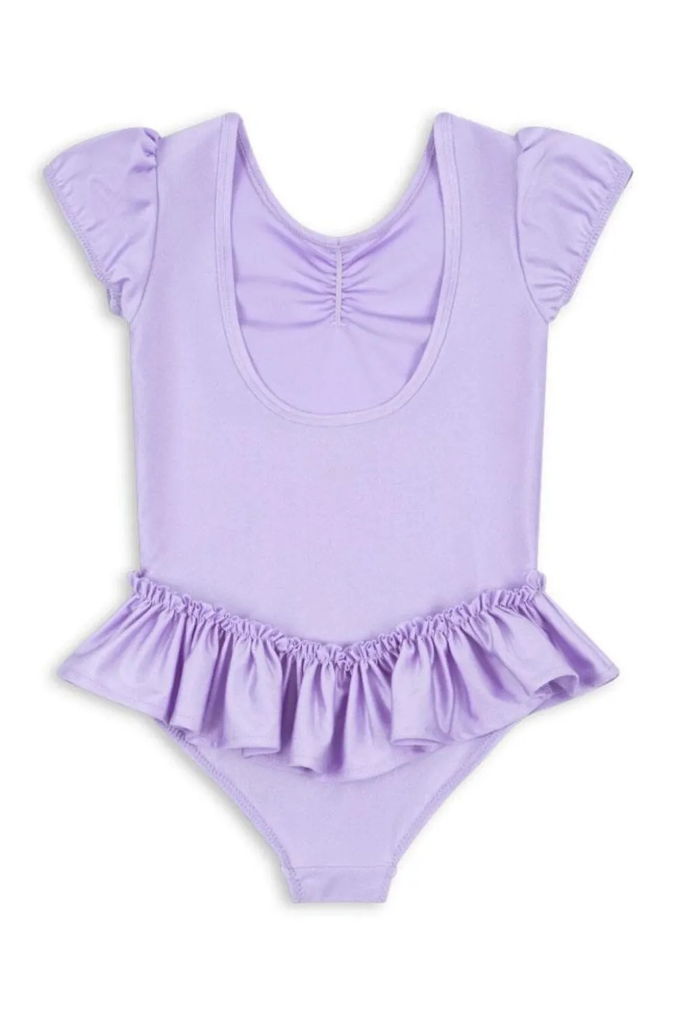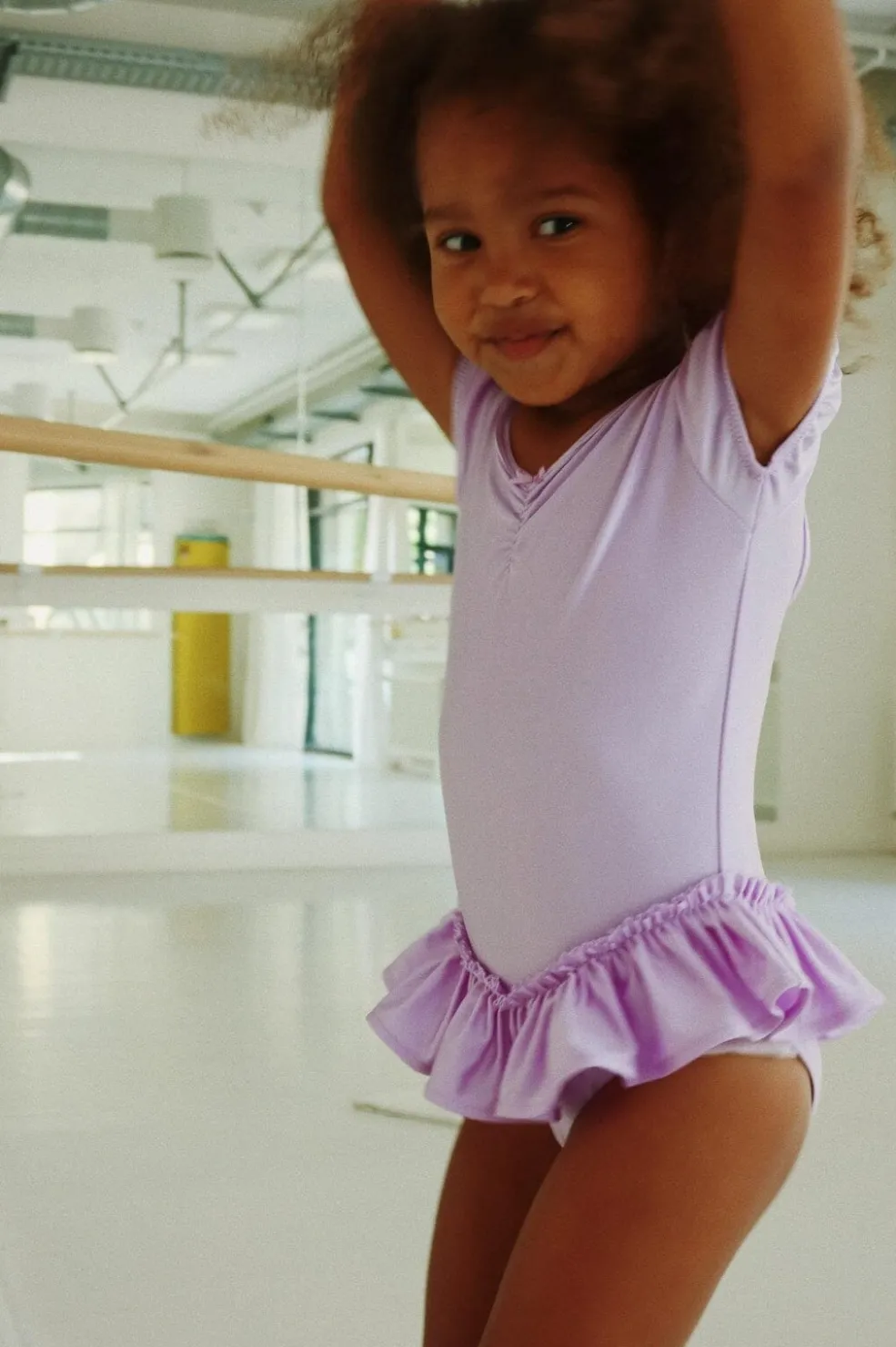 Lavendel lilla tutu-kjole fra Konges Sløjd med tylskørt og flæsekanter. De korte ærmer og den runde hals giver en enkel overdel til den pyntede nederdel.