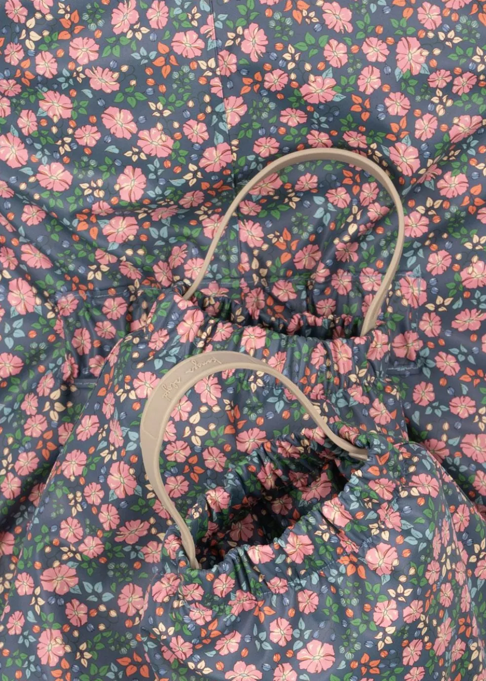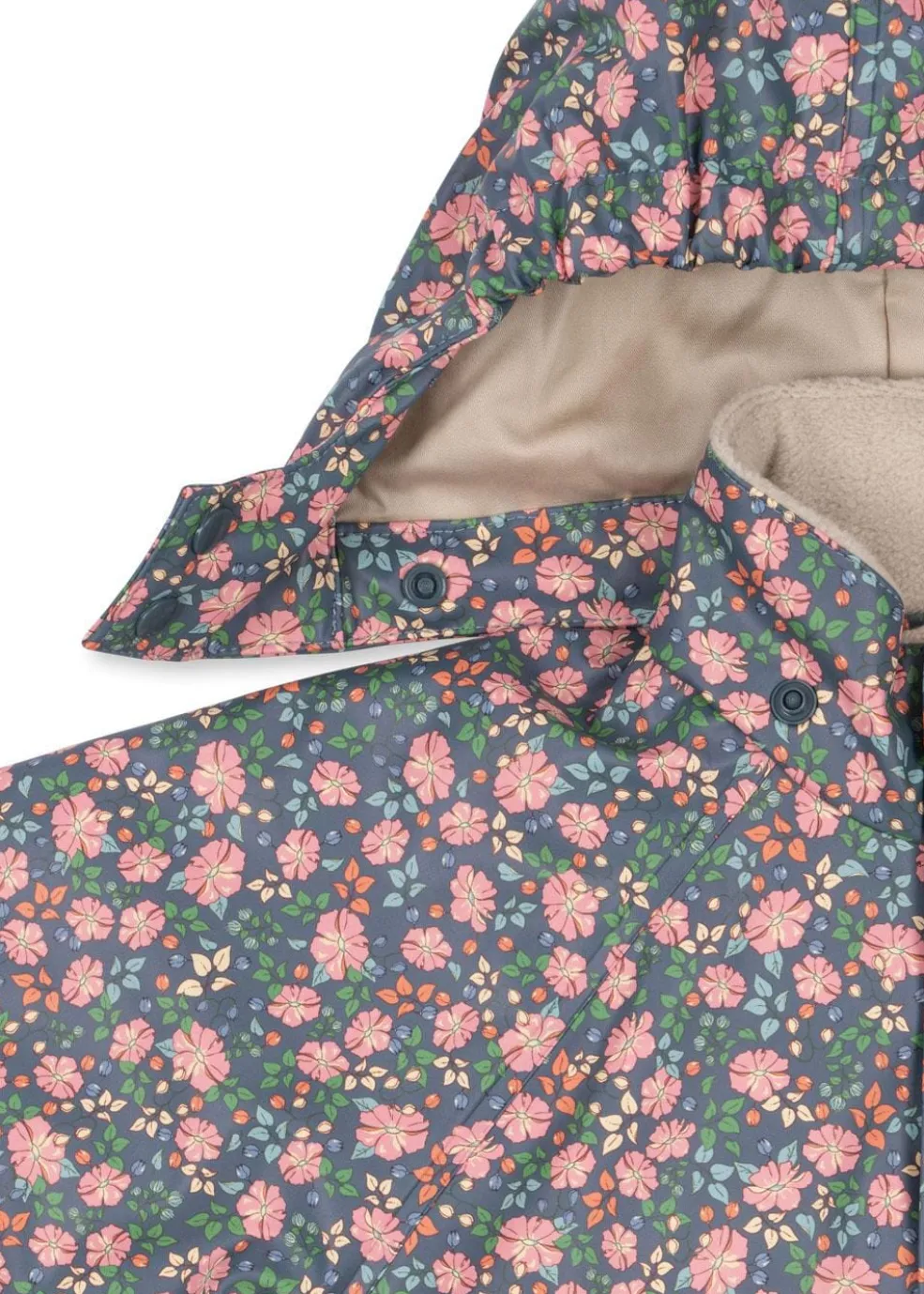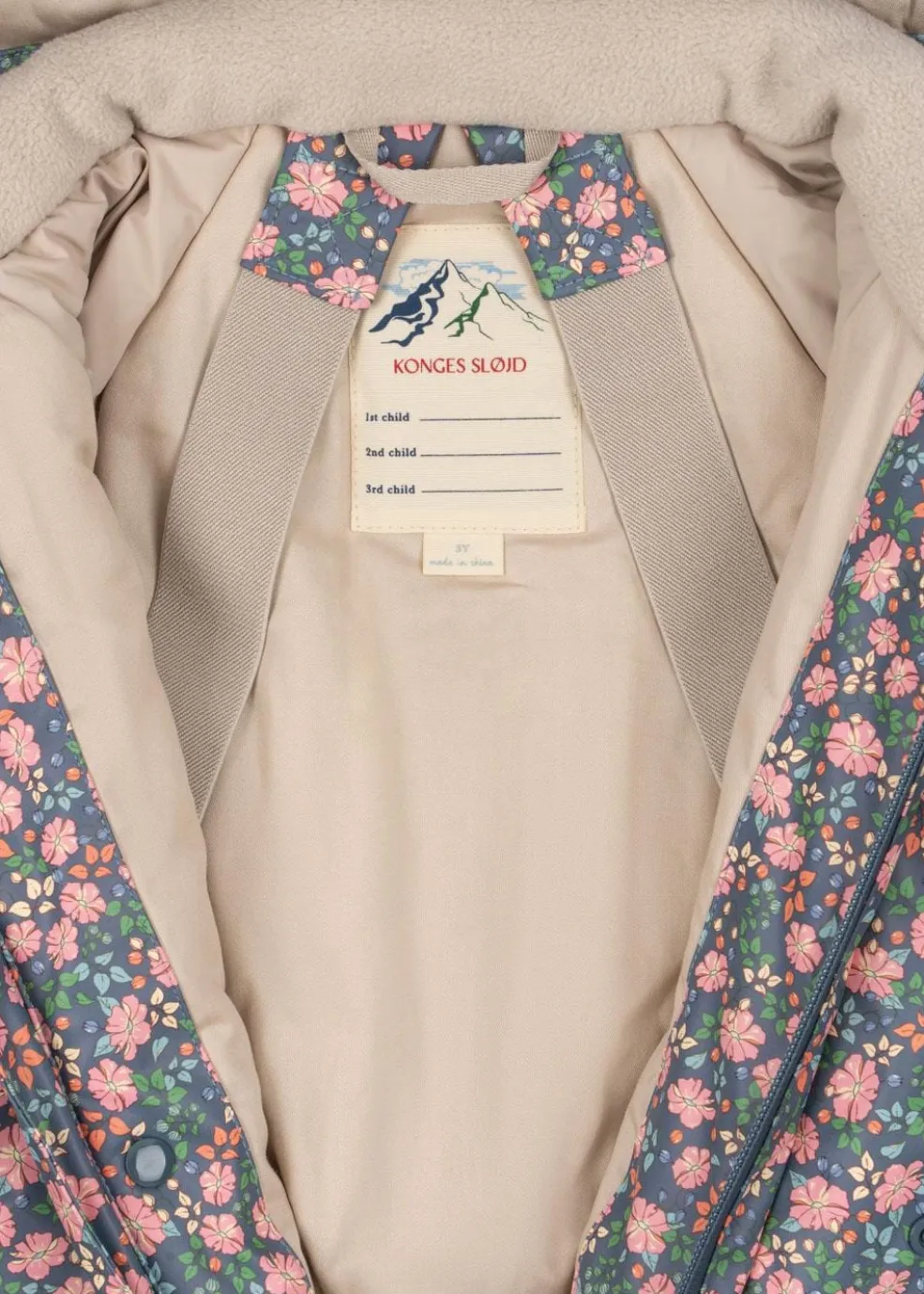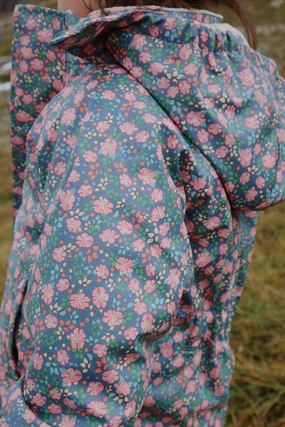 Flyverdragt fra Konges Sløjd med blomstermønster i pink, grøn og orange på en blå baggrund. Dragten har høj hals og ankellængde.